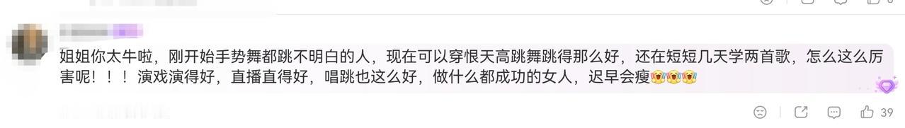 有人说,姐姐你太牛啦,刚开始手势舞都跳不明白的人,现在可以穿恨天高跳舞跳得那么好,还在短短几天学两首歌,怎么这么厉害呢!!!演戏演得好,直播直得好,唱跳也这么好,做什么都成功的女人,迟早会瘦……