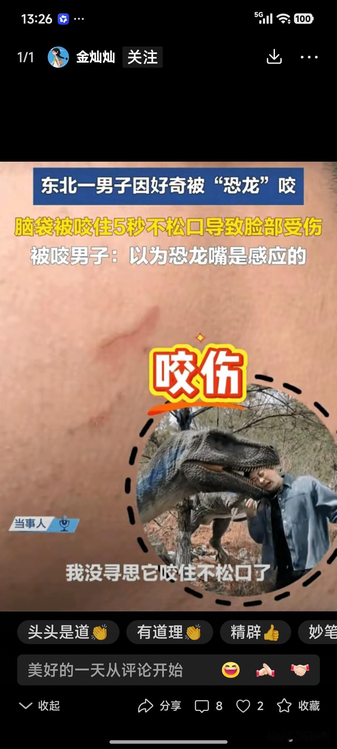 有人报道说,东北一男子被“仿真电动恐龙”咬伤了。