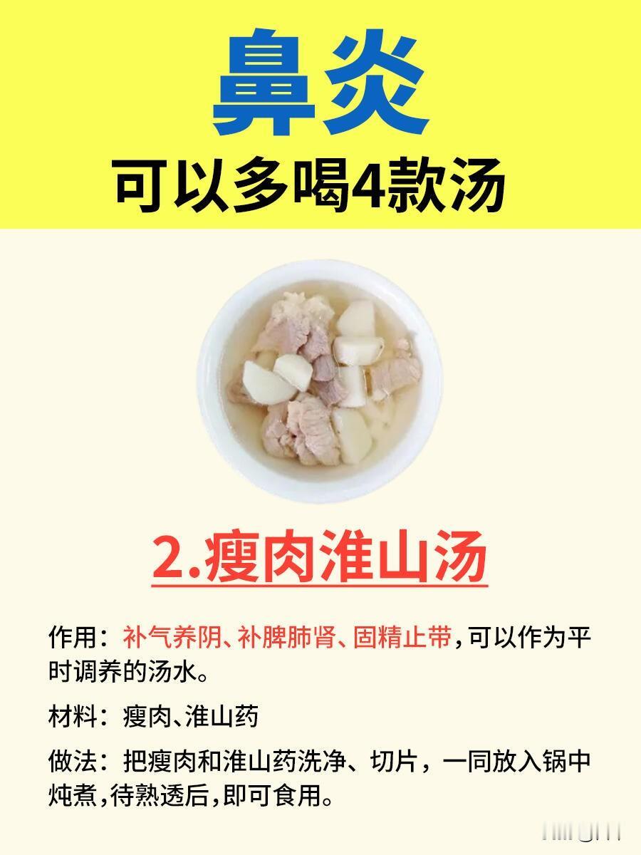 做法超简单,瘦肉和淮山药切块同煮,就能补气养阴、补脾肺肾,适合平时作为日常调养汤。长期喝能让肺的功能更稳定,减少鼻炎发作的频率,特别适合体质偏虚的人。