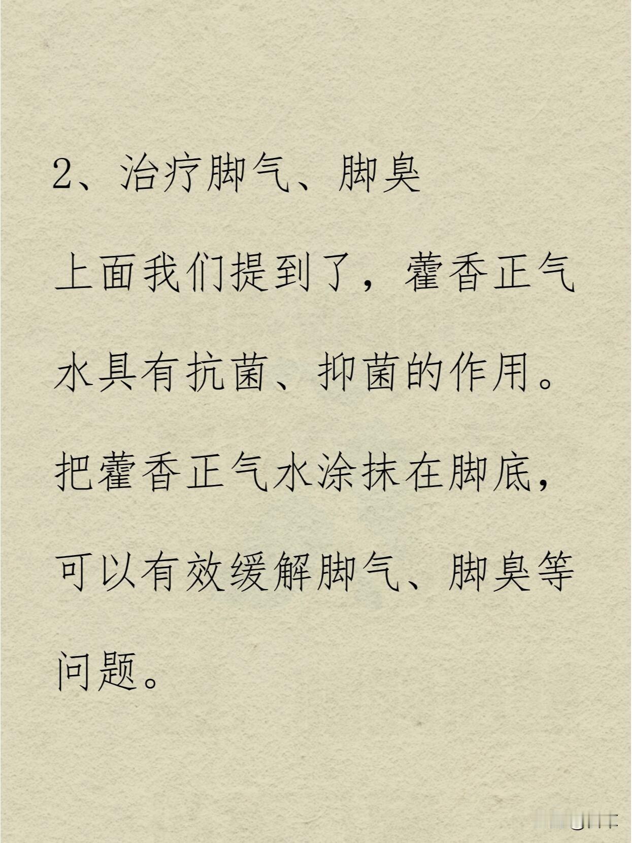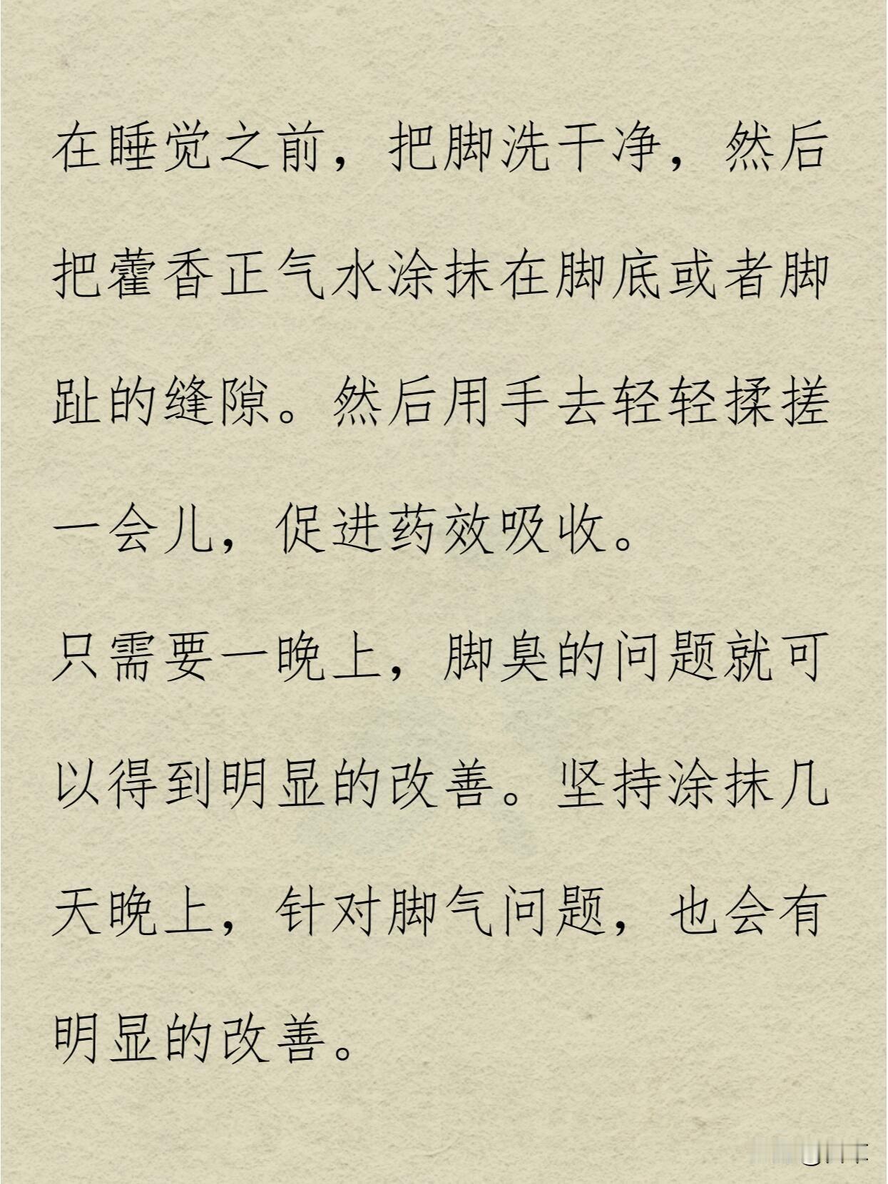 睡前把脚洗干净,把藿香正气水涂抹在脚底和脚趾缝隙,轻轻揉搓促进吸收。