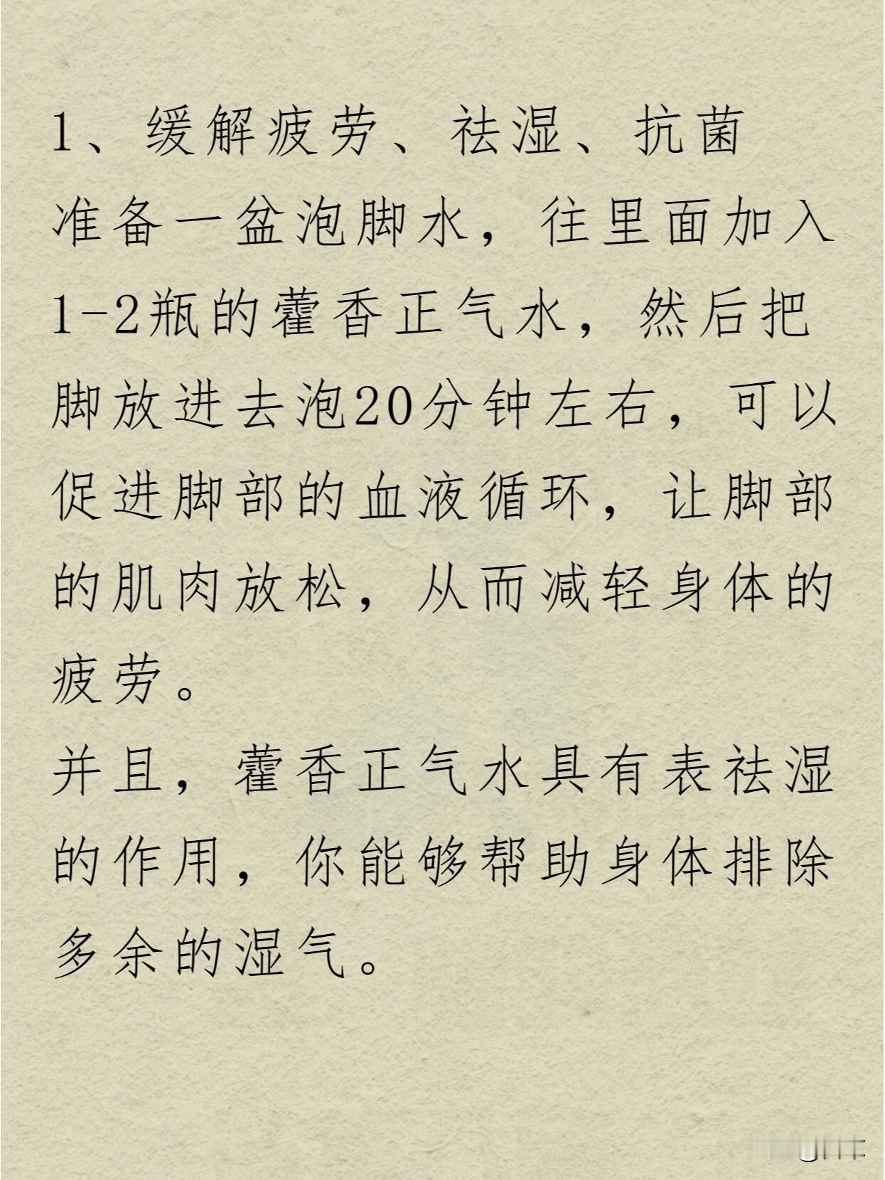 把1-2瓶藿香正气水加入泡脚水里,泡20分钟左右,能促进脚部血液循环,放松肌肉,帮你缓解一天的疲惫。