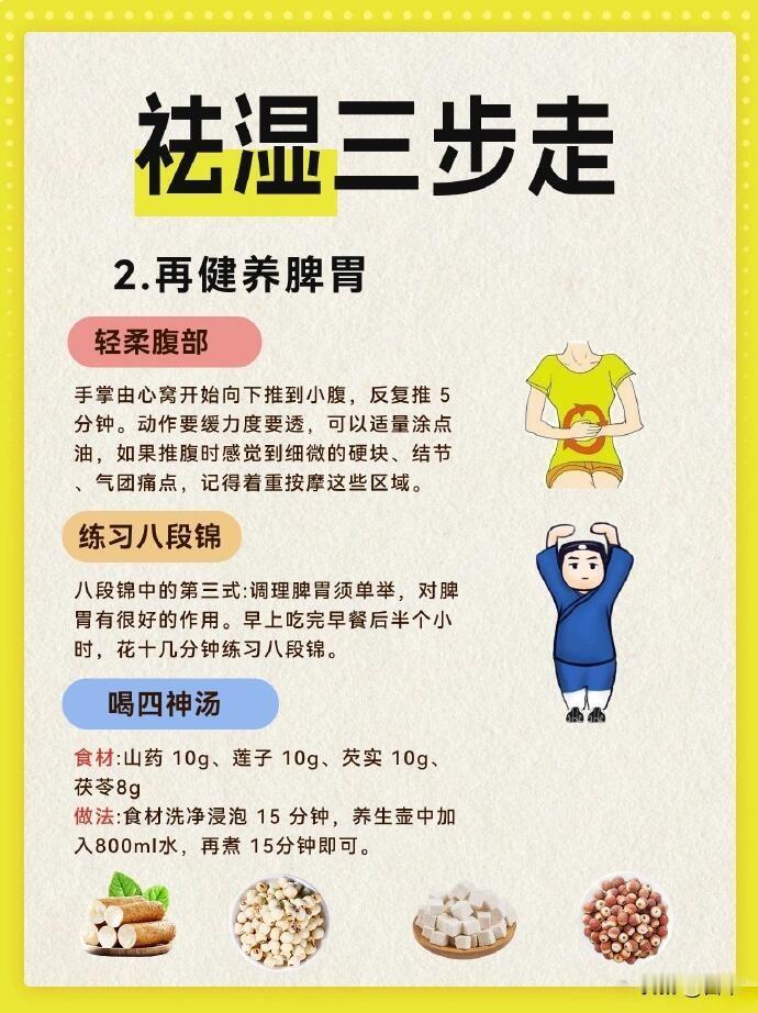 - 喝四神汤:山药、莲子、芡实、茯苓煮水,健脾祛湿很温和。