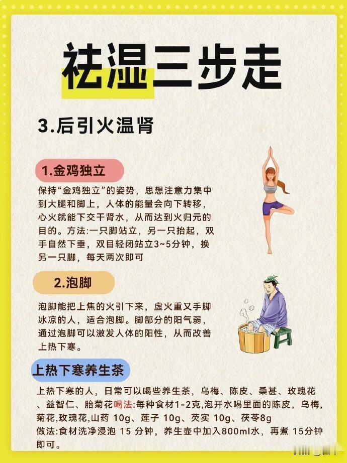- 金鸡独立:单脚站3-5分钟,引火下行,改善上热下寒;