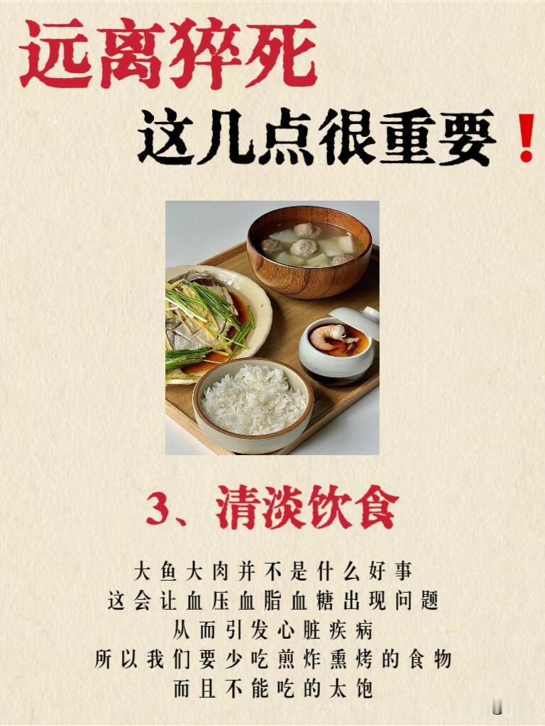 3. 坚持清淡饮食:少吃大鱼大肉、煎炸熏烤食物,避免血压、血脂、血糖异常,减轻心脏负担。