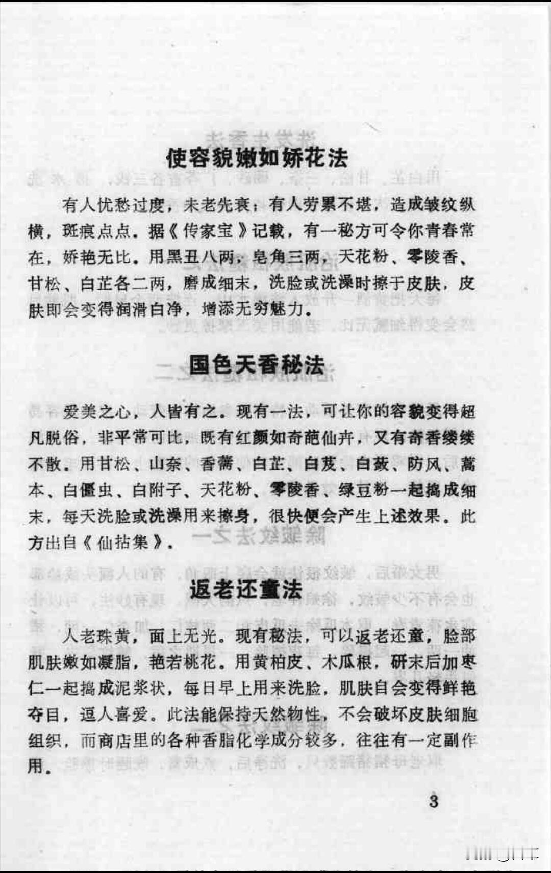 - 国色天香秘法:甘松、山奈、白芷等多味草药磨粉擦身,不仅能让肌肤细腻,还能留下淡淡香气,兼顾护肤与香体。