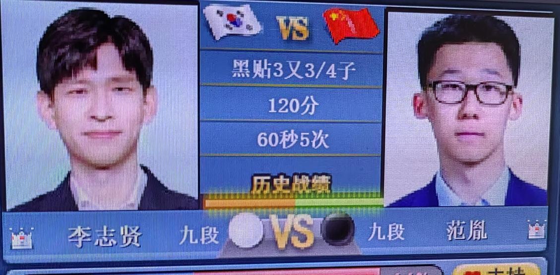 范胤执黑先行;李志贤执白棋。目前行至第27手,目前均势。