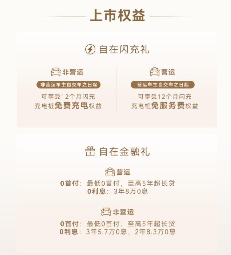 下定4重礼,包括闪充权益,营运车辆可以享受12个月闪充充电桩免服务费权益(仅限领先版和高能版)