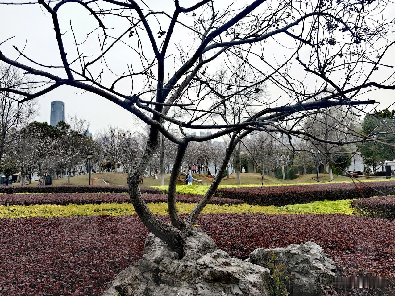 冬日落尽了叶子,枝桠斜斜挑向天空,像在诉说一场关于生命力的倔强。这石与树的纠缠,成了公园里最动人的注脚——原来生命从不会被坚硬困住,反而能在缝隙里,长出最动人的姿态。