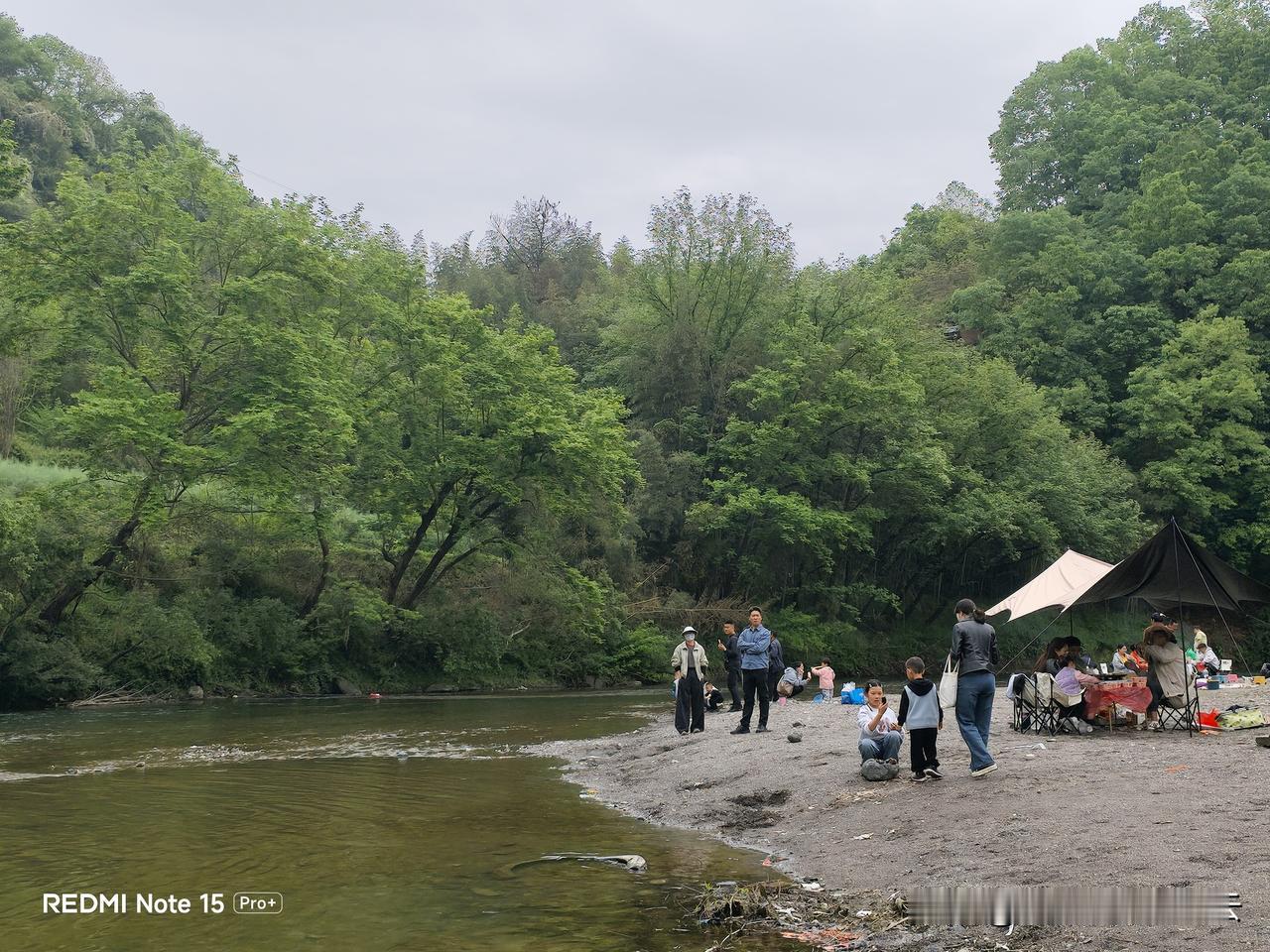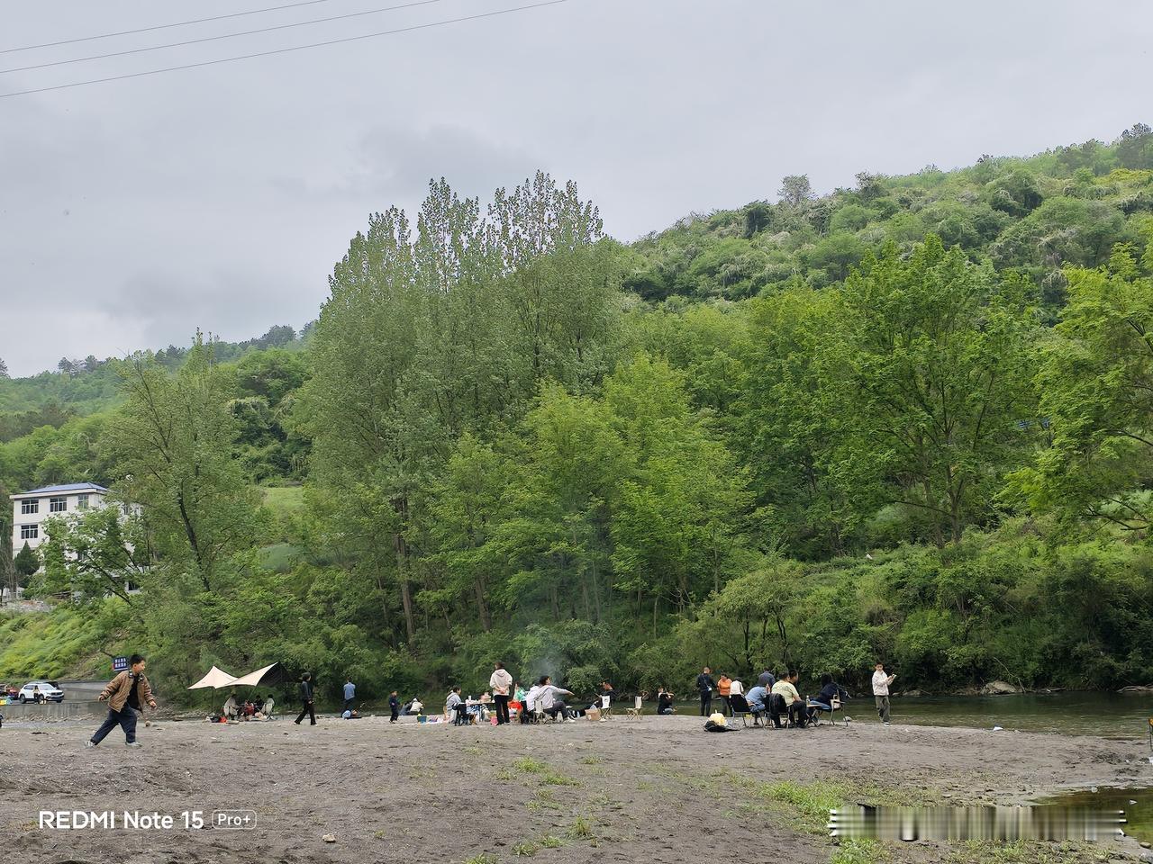 西面,河边一大片开阔的沙地,游人在此搭着帐篷,支起小桌,在此小憩。有小孩拿着钓鱼竿在河中钓鱼,还有孩子在沙地中奔跑追逐嬉戏 ,快乐无比。