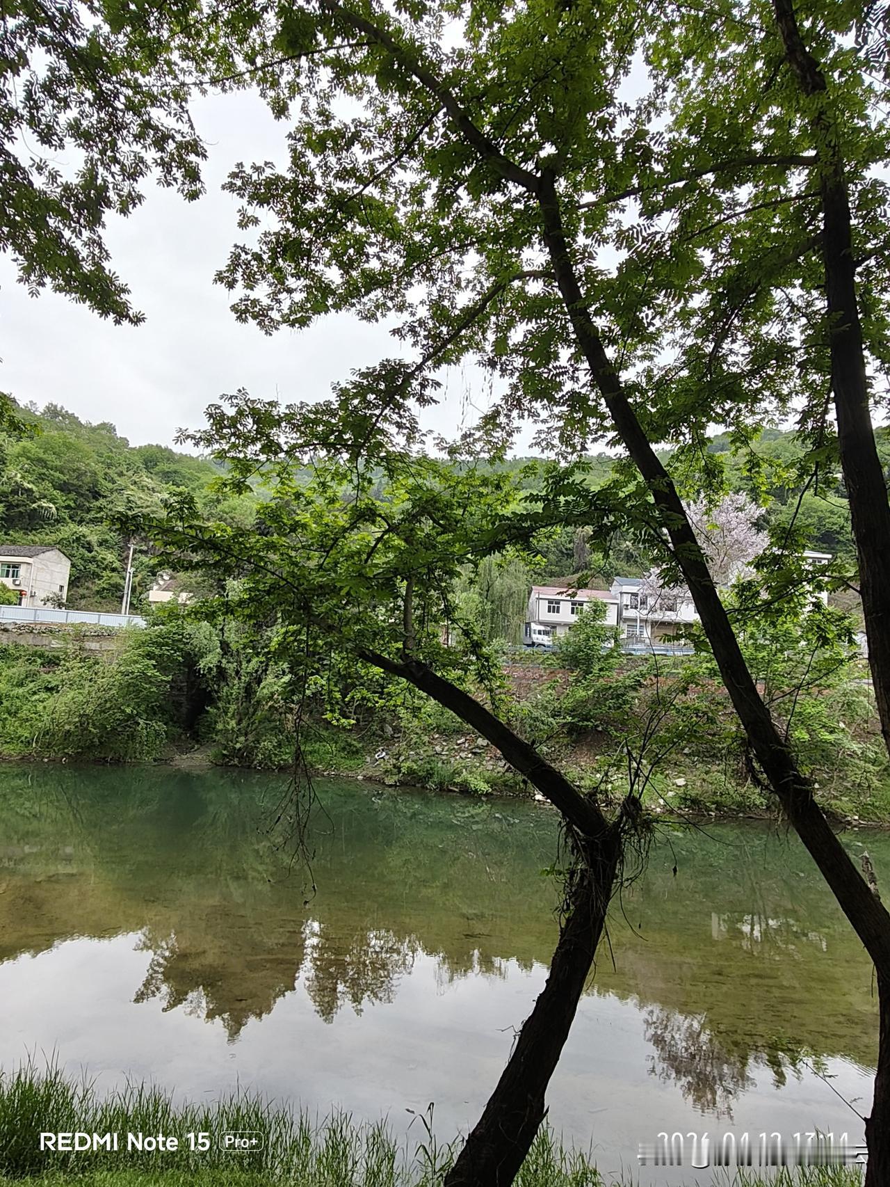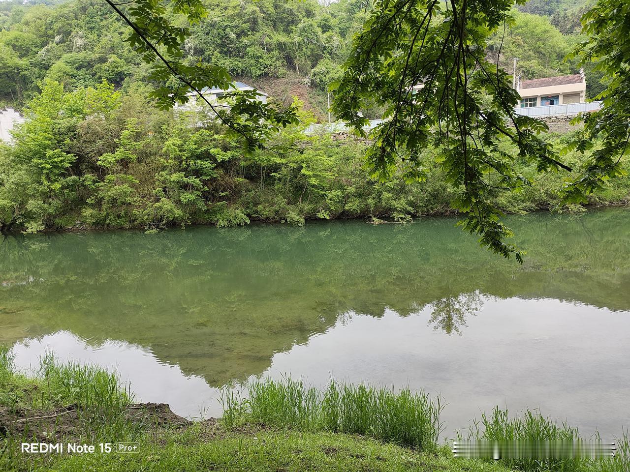 站在桥上远望,河水清澈见底,空中的白云水中游弋,绿树的倒影在河水中摇曳多姿。