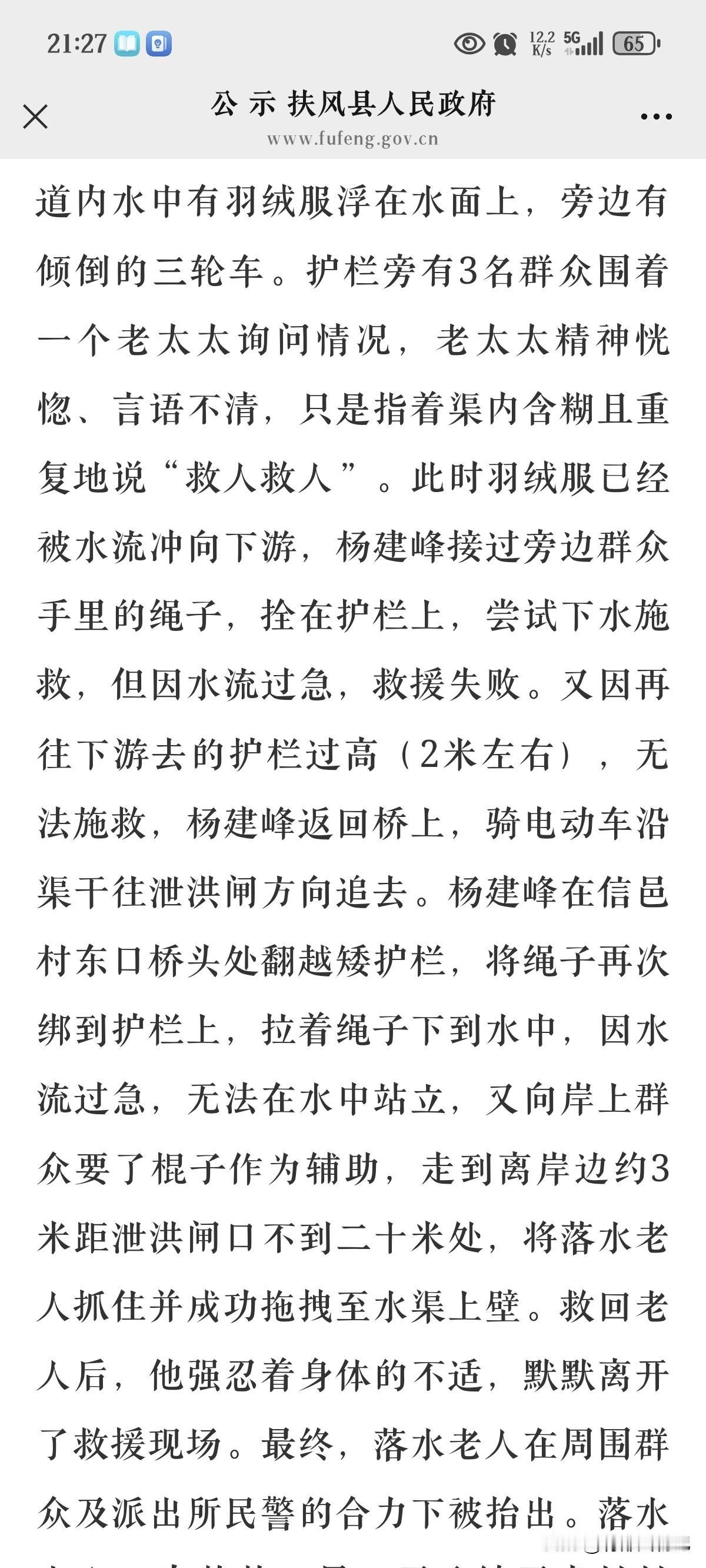 2025年12月16日下午,杨建峰途经信邑村大桥时,听闻群众呼救,发现有人连同三轮车坠入引渭渠,水流湍急。他当即停车施救,初次下水因水流过急未果,便骑车沿渠追赶,换位置绑绳下水,借助木棍奋力将落水老人拖至渠边。事后他不顾身体不适默默离开。遗憾得是老人经医护抢救无效离世,其妻子受伤住院。后续家属携带礼品登门致谢,杨建峰均婉言谢绝。