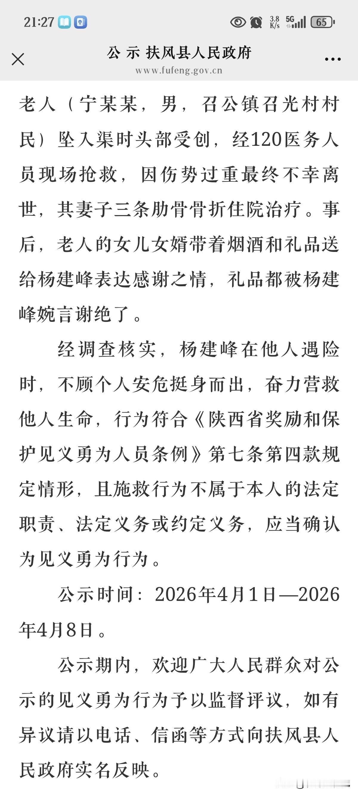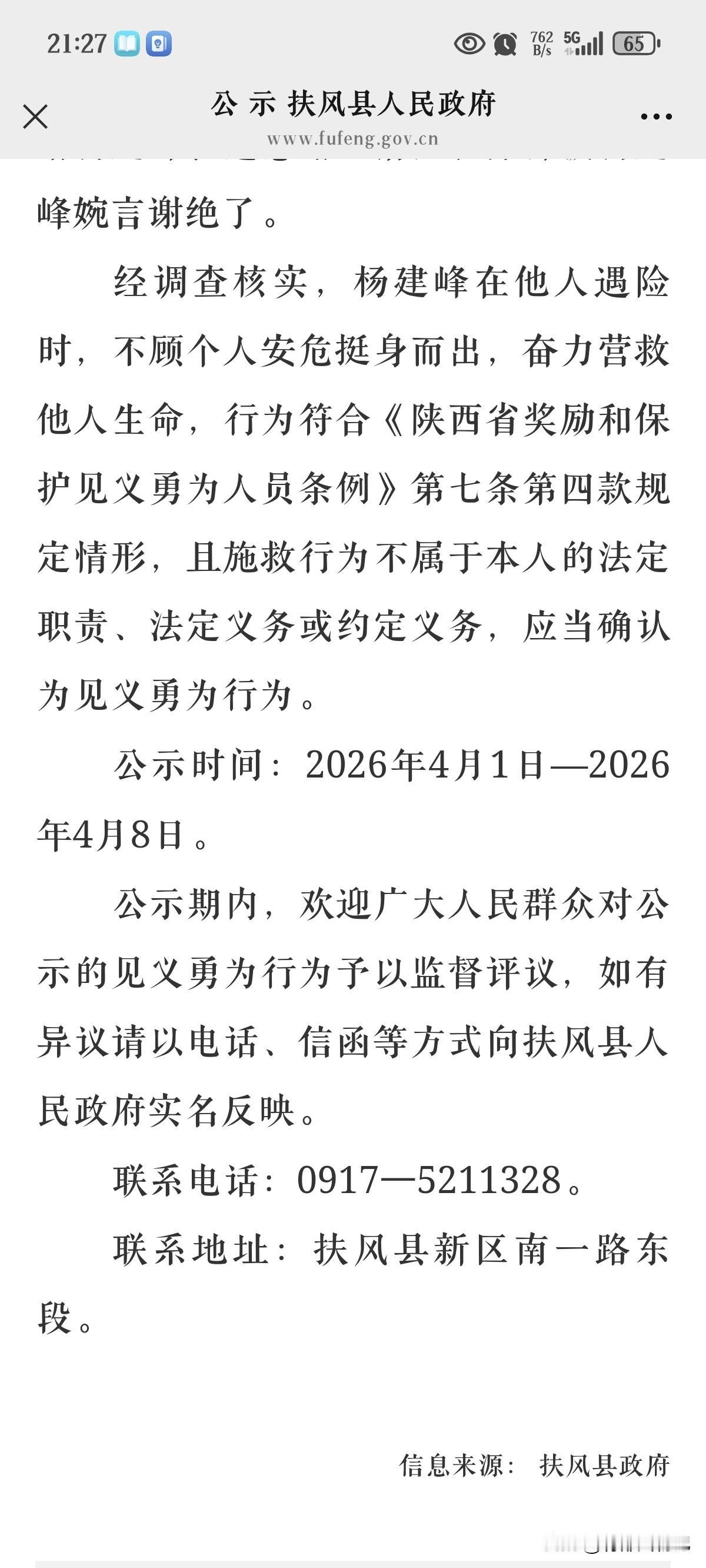 弘扬社会正气,扶风县对“杨建峰见义勇为行为”进行公示。 2025年12月