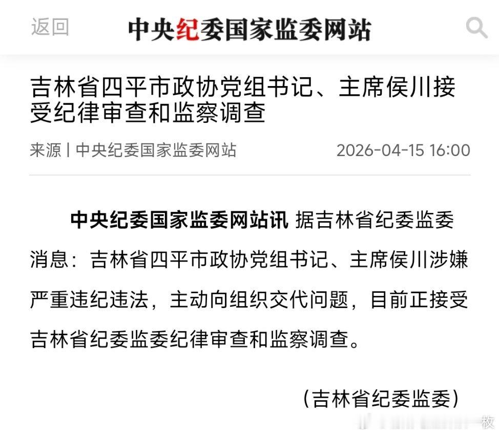 吉林省四平市政协党组书记、主席侯川接受纪律审查和监察调查!