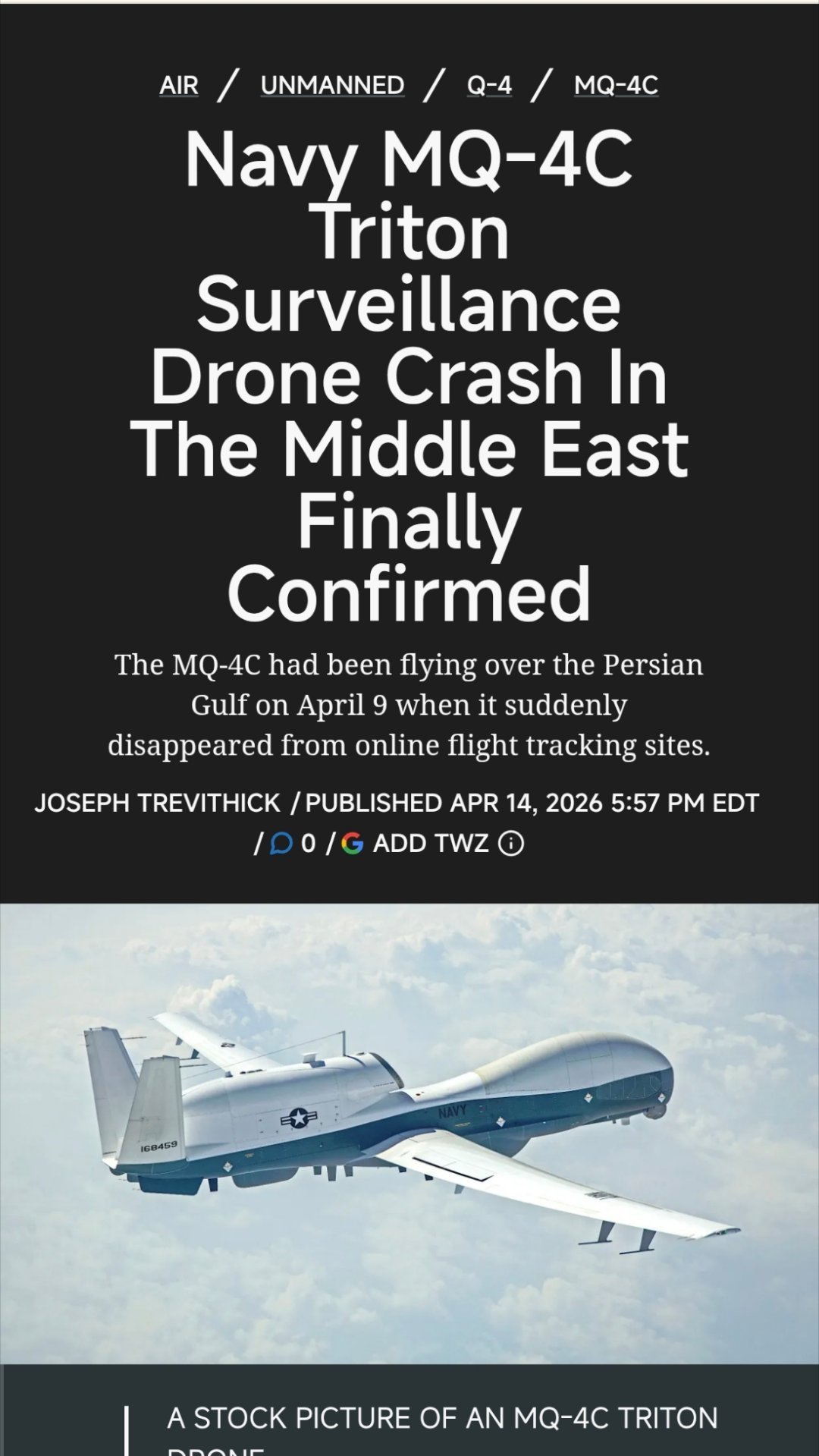 ² 划重点:4月9号就丢了,但丢哪去了不知道。最后一次联系上是在飞往伊朗的公海上空。2019年,伊朗曾经击落过MQ-4C无人机的前身,并展示了残骸。要是这一次还是伊朗击落的,那价值更大。