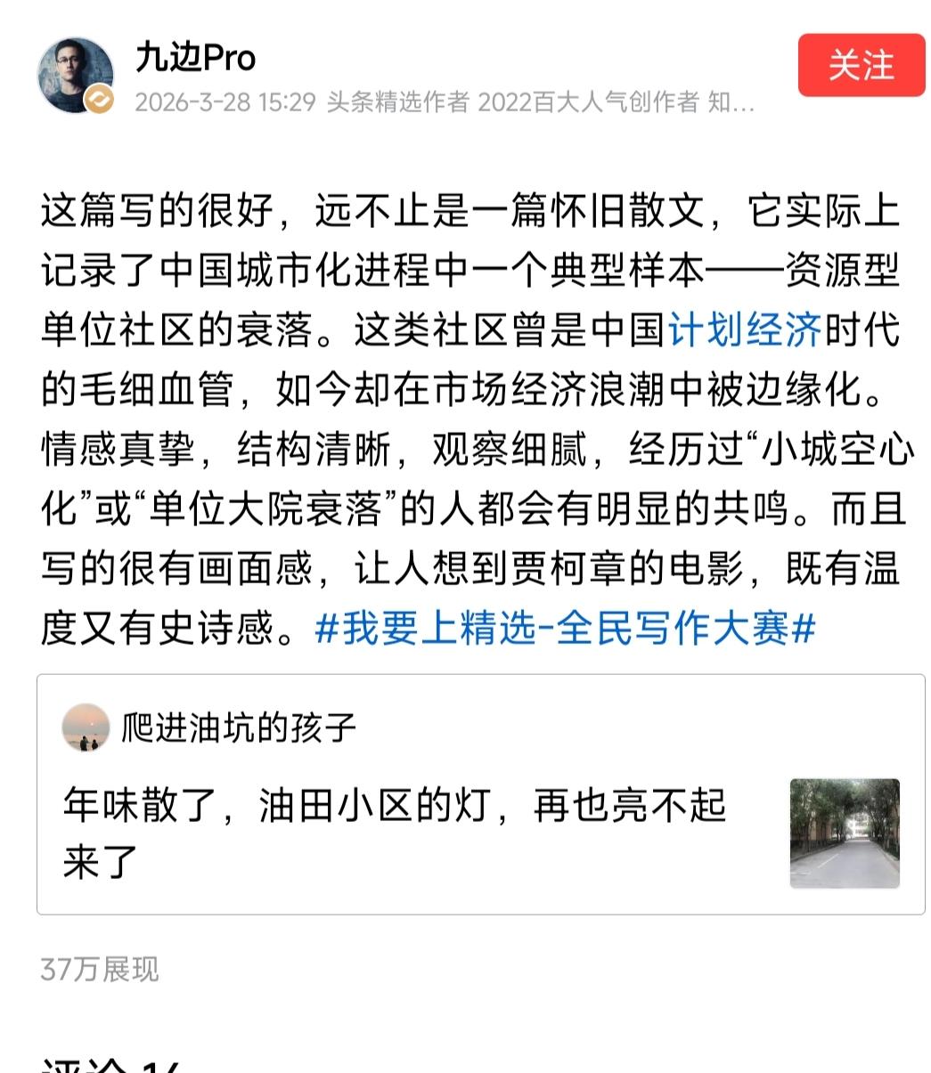 九边Pro老师这篇点评太到位了,一眼就抓住文章的核心,不仅看到了怀旧散文的温情,更精准点出它记录资源型单位社区衰落的时代价值。