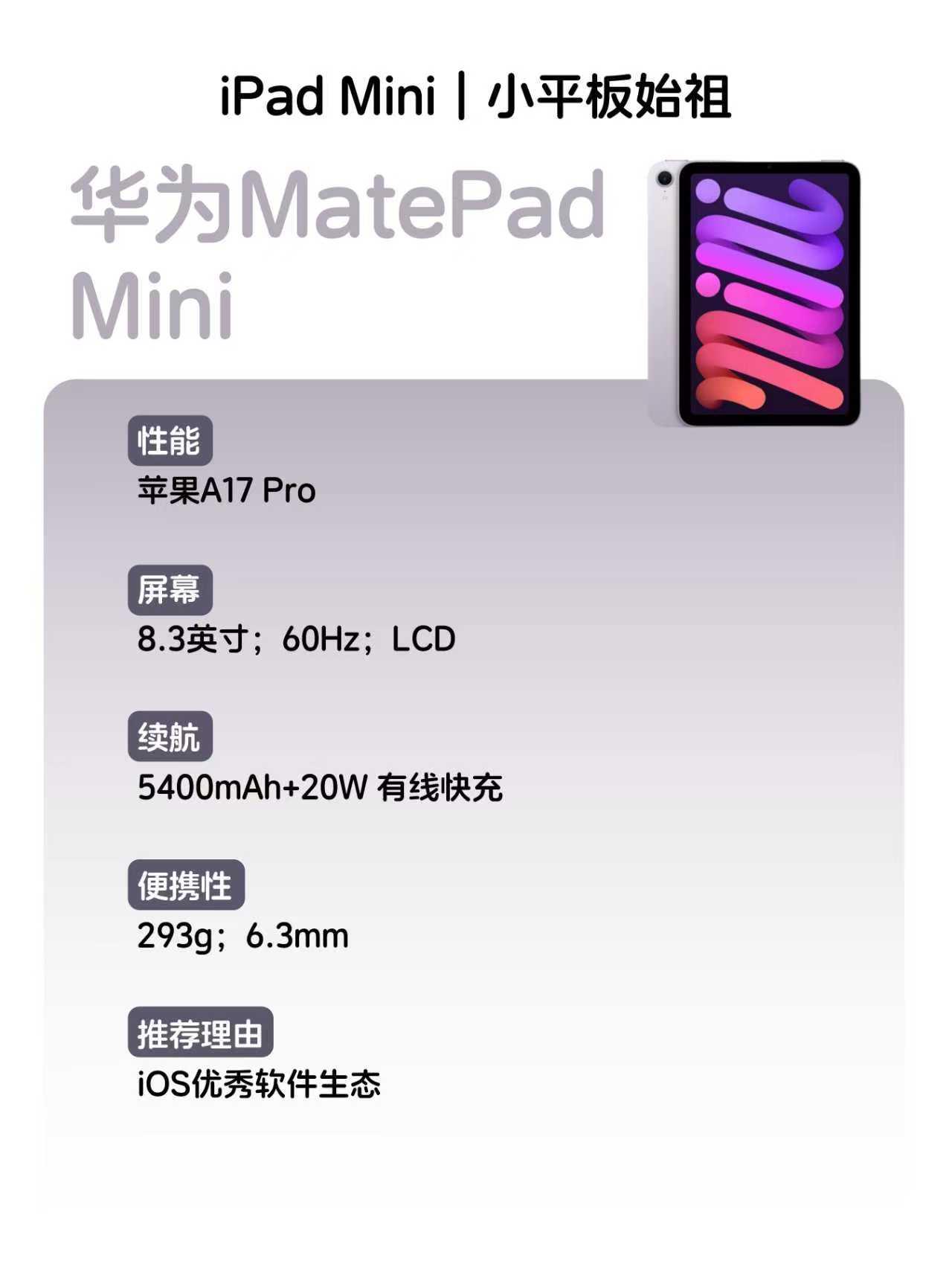 iPad mini7:小平板里的常青树了,A17 Pro性能说得过去,独占创作类软件较多,但鉴于屏幕刷新率只有60Hz,其实也不太推荐了,玩一些支持高刷的游戏不太过瘾。但如果说被绑定在苹果生态上了,那没办法只能选它。