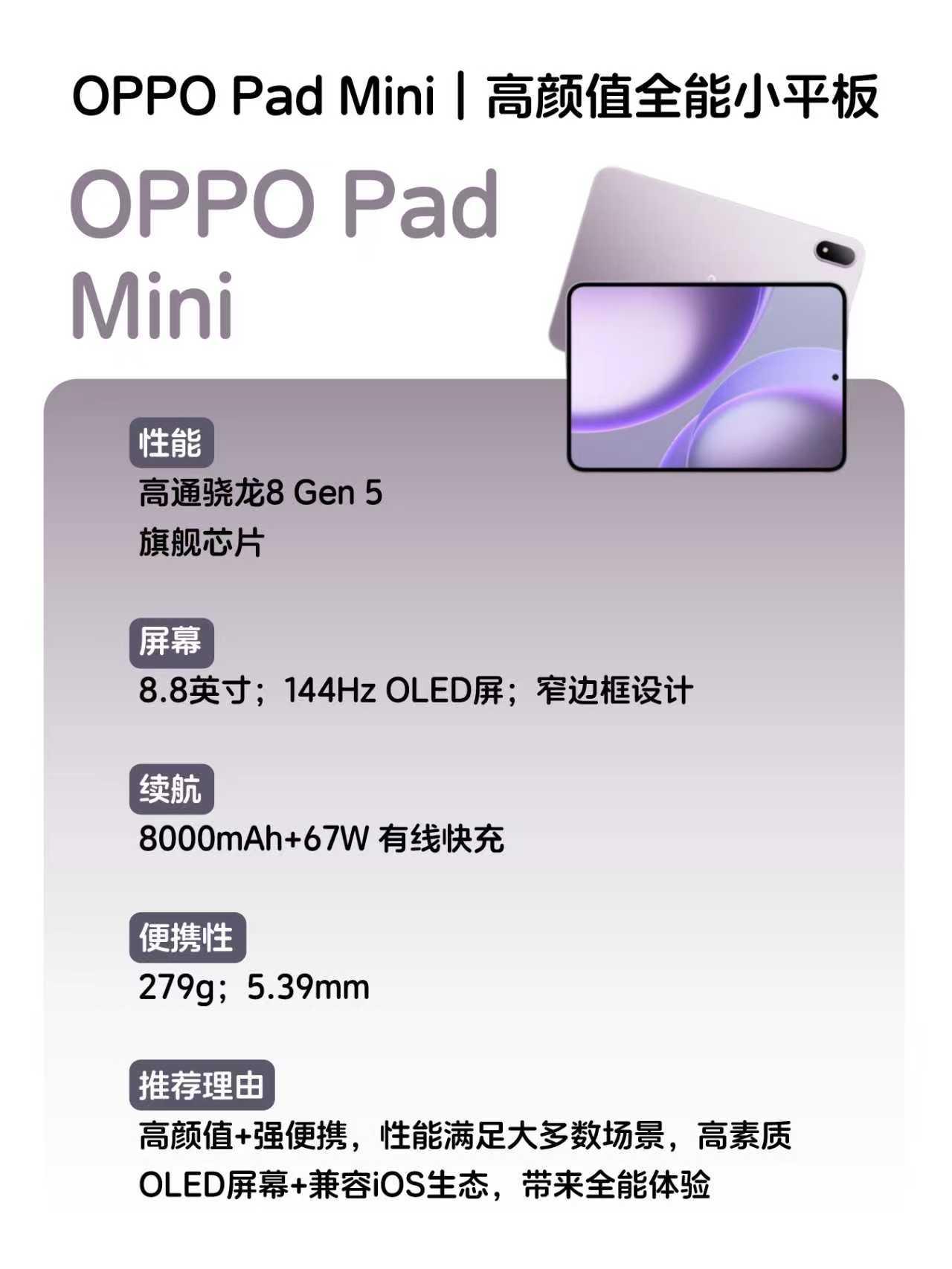 OPPO Pad mini:小平板里堆料比较顶的全能小钢炮!8.8英寸OLED屏幕色彩显示、超窄边框,正面视觉冲击感很强!处理器给到骁龙8 Gen5,主流大型游戏随便玩。