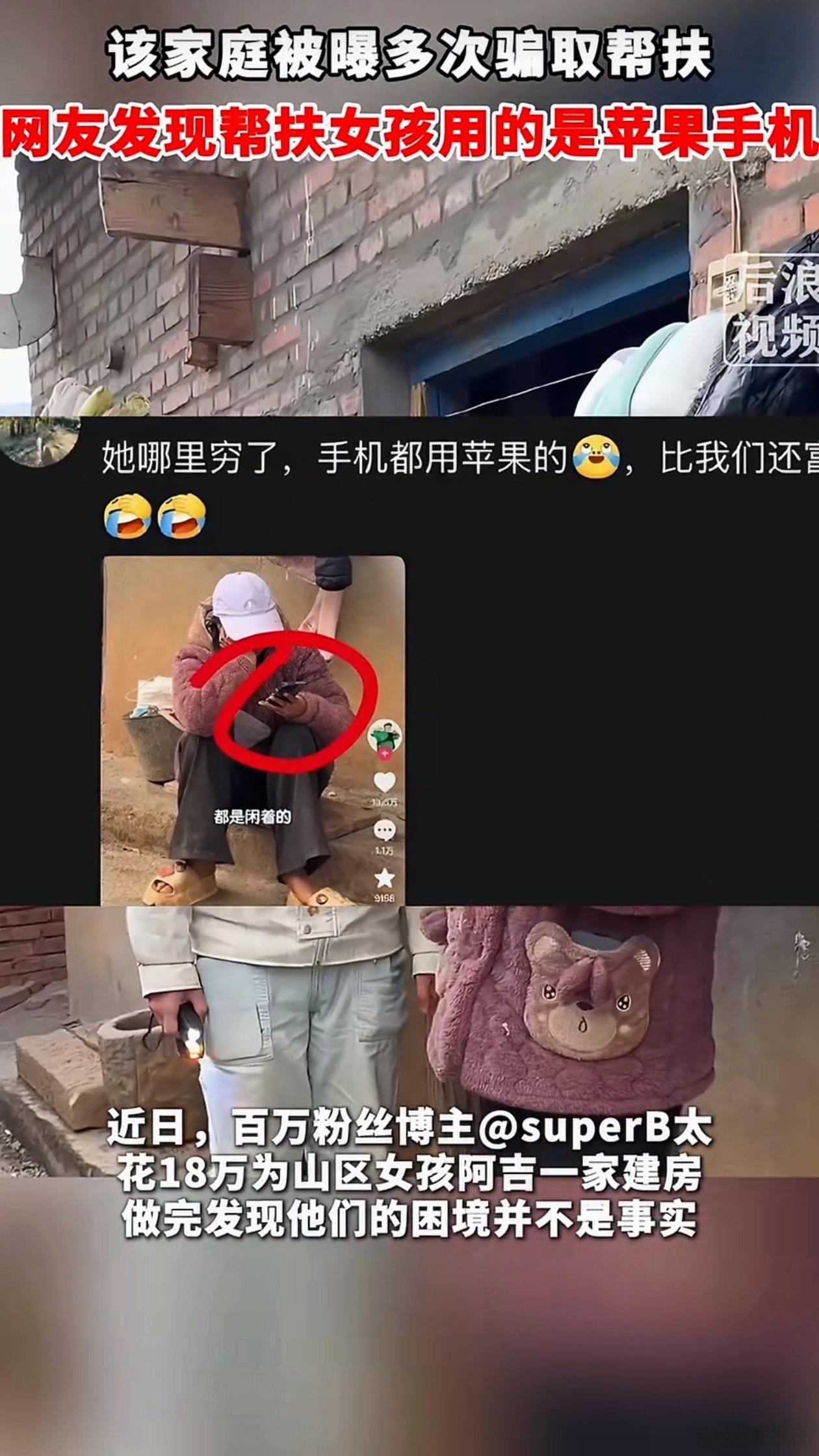 B太帮扶大山女孩用苹果手机我当时看到这个画面也觉得奇怪,有钱买iPhone怎么会需要帮扶?但我又想也许是山寨的苹果,或者是好心人送的,还是太善良了