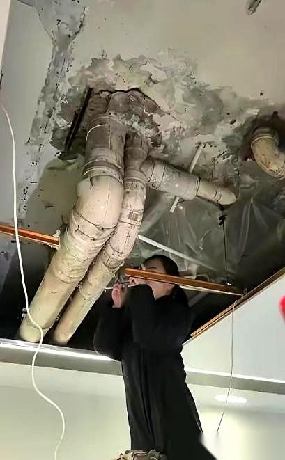 工人撬开吊顶,一瞬间,向女士捂住了嘴。