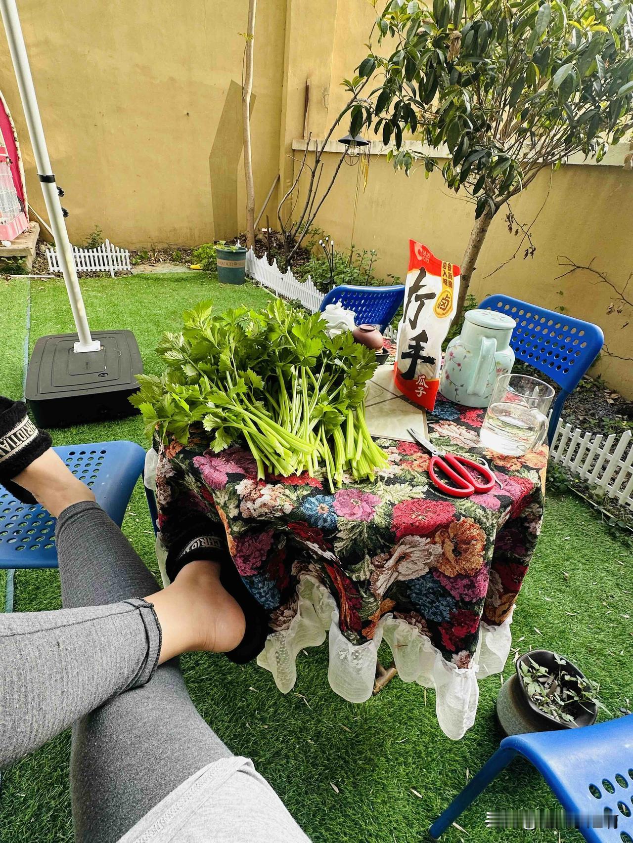 又掐了一大把芹菜,摘摘,炒个虾吃。