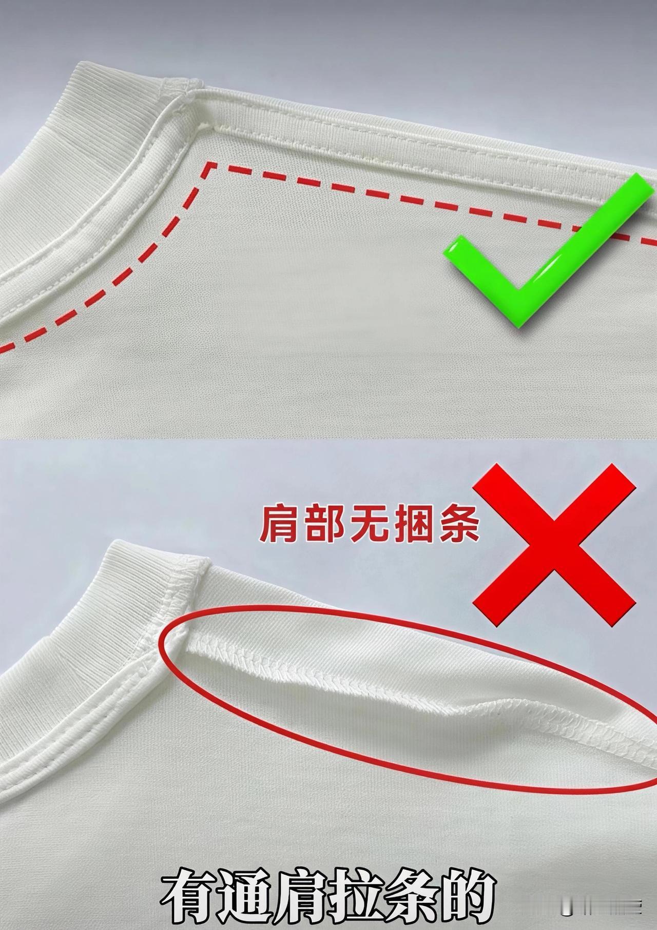 (5)看肩部:这个细节90%的人都忽略!一定要看有没有通肩拉条,有它能固定肩部版型,穿两三年都不鼓包;没有通肩拉条的,穿俩月肩线就支棱起来,整件T恤版型直接垮掉。