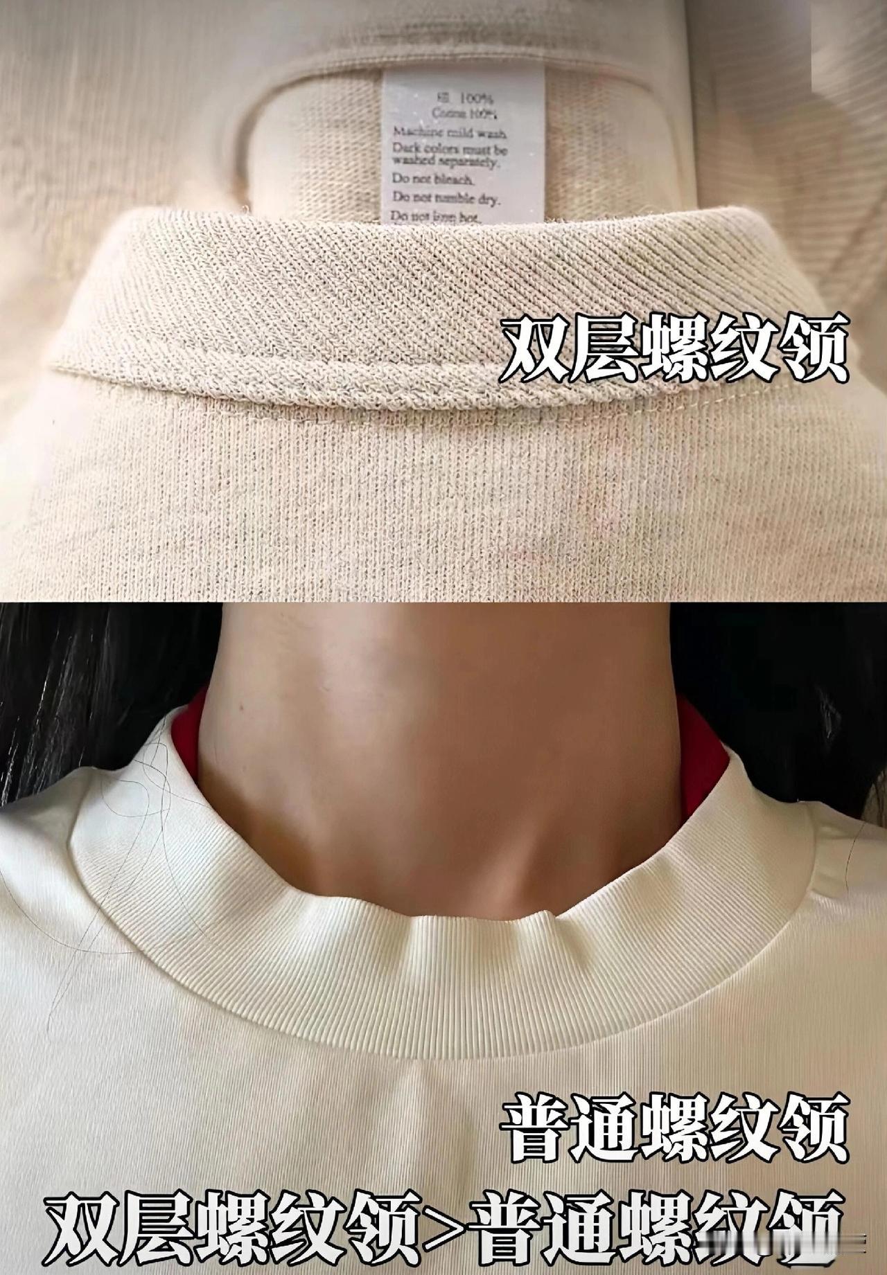 (2)看领口:领口就是T恤的命根子!一定要选双层螺纹领,耐穿又挺括;普通螺纹领次之,那种和衣身用一样布料的本布领,白送都别要!翻翻看你衣柜里穿废的T恤,十有八九都是这种本布领,洗一次就垮形。