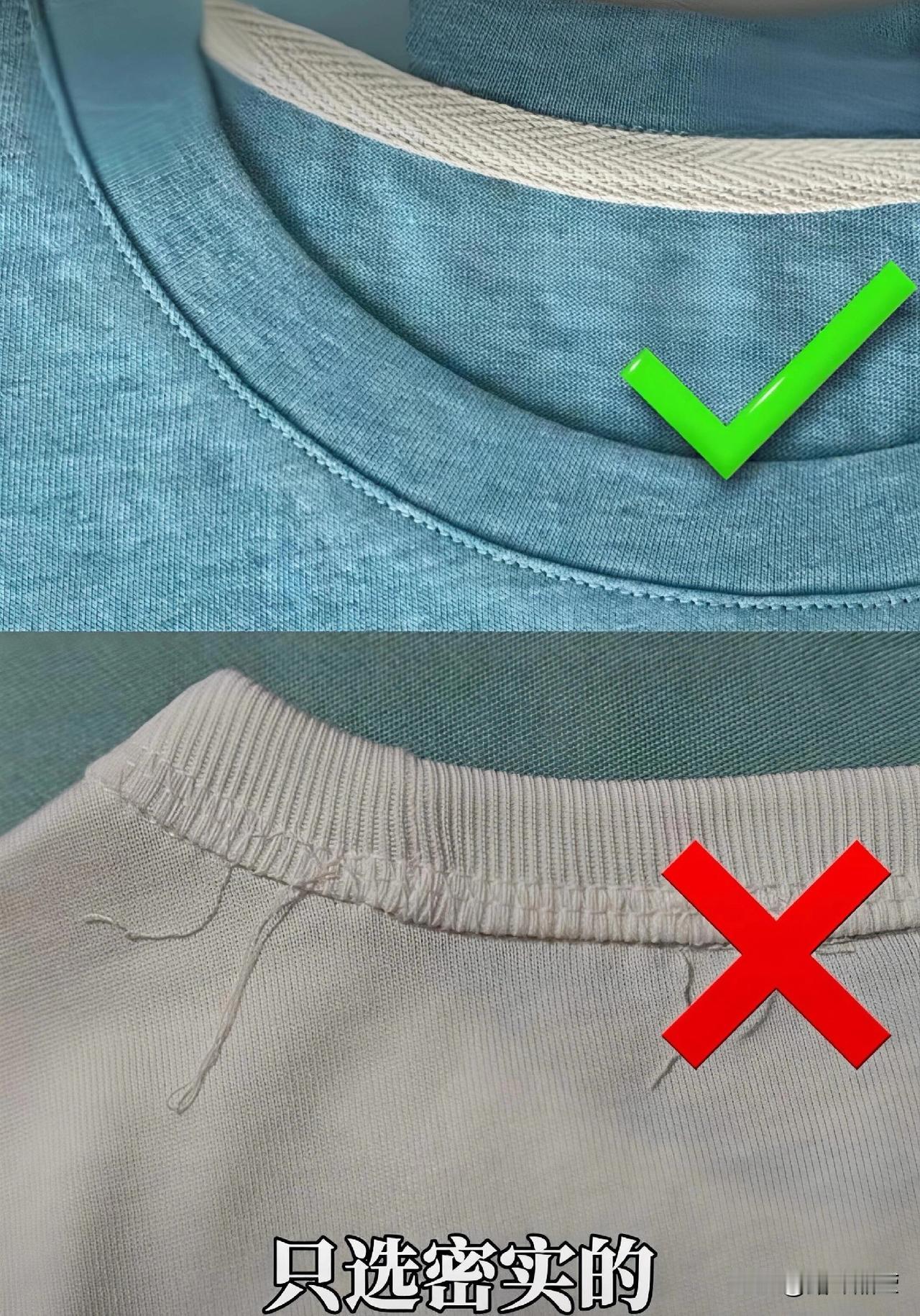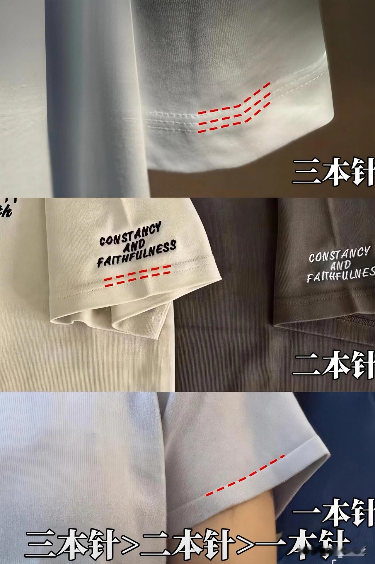 (3)看工艺:挑T恤看缝线,认准三本针准没错!三本针>二本针>一本针,一本针做工粗糙,领口没穿多久就松垮开线,三本针走线密实牢固,耐穿度拉满,质感一下子就上来了。