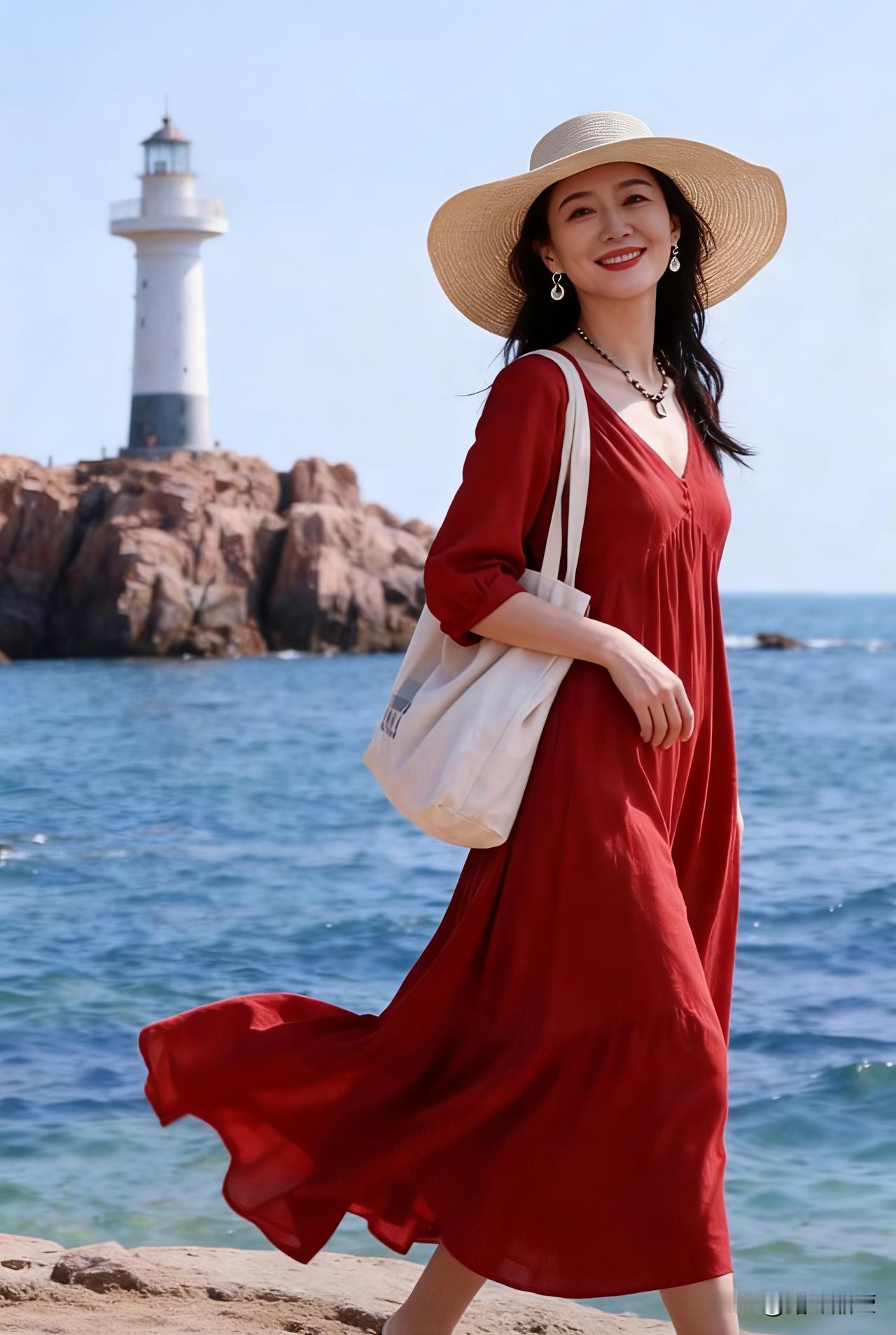 红裙子配大海特别出片,浅蓝色和海天很搭,风一吹氛围感就有了。
