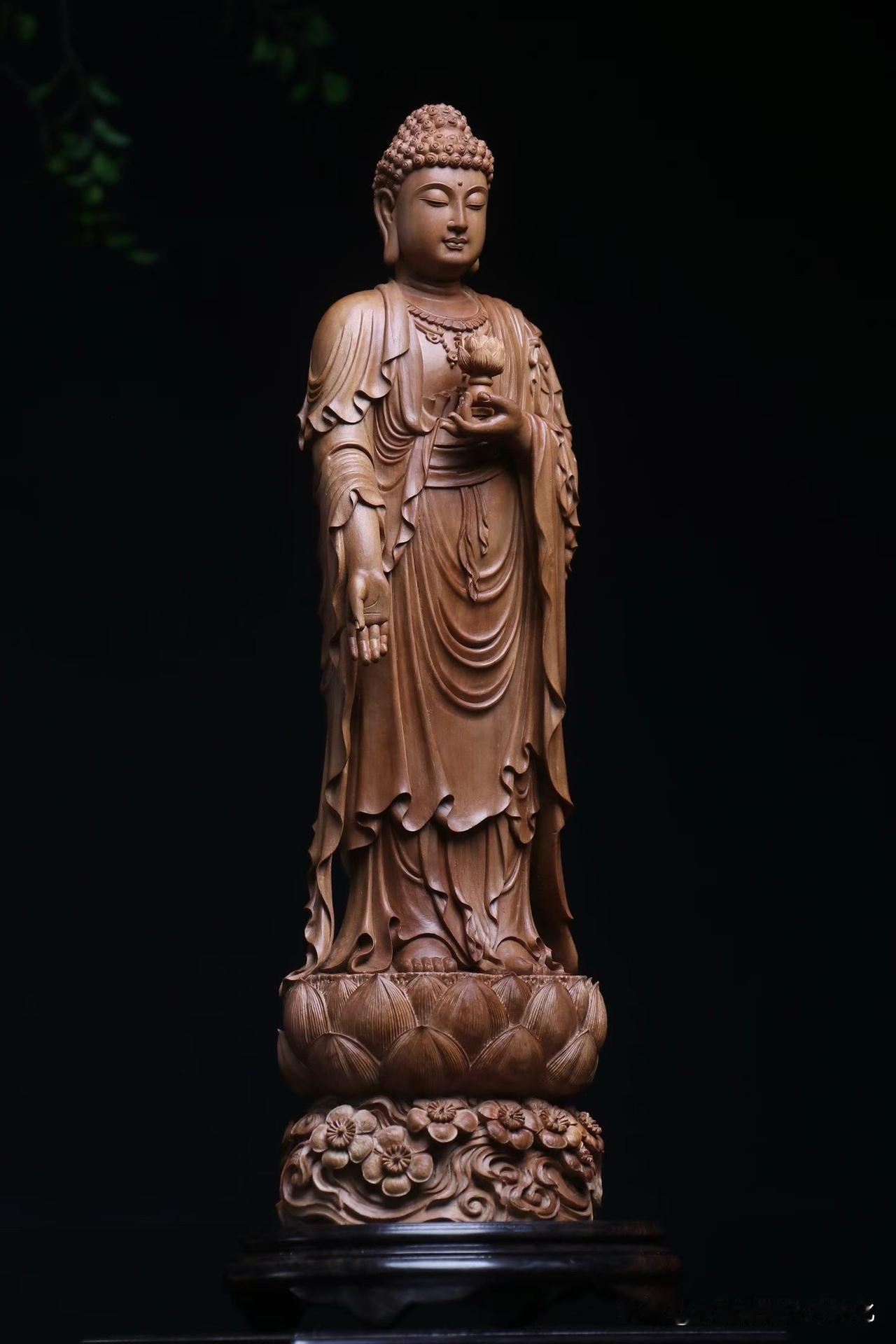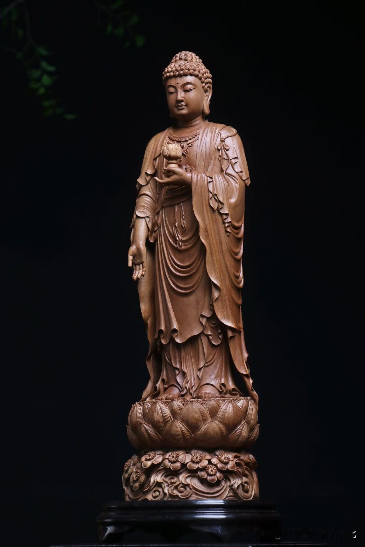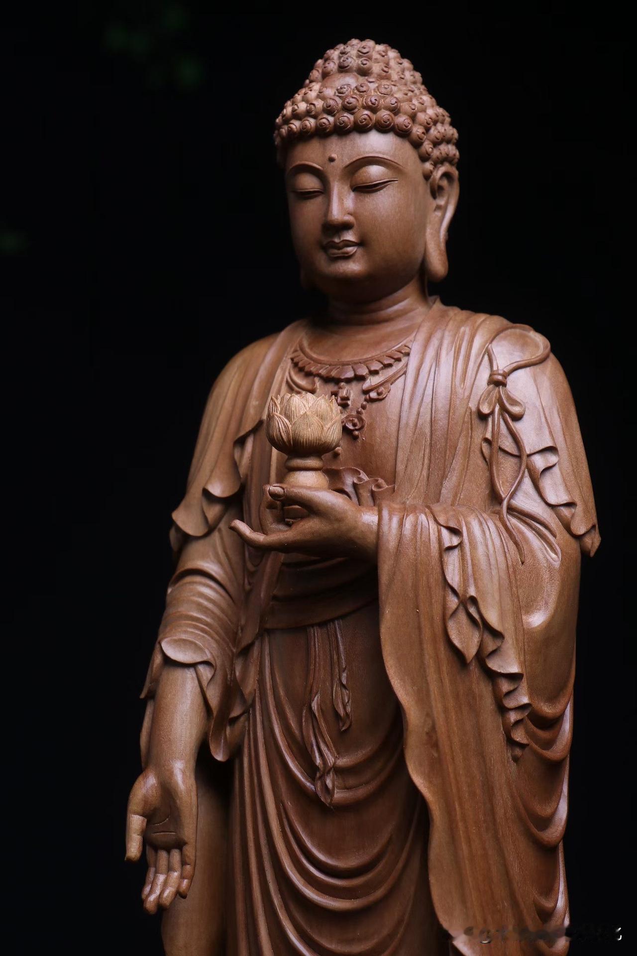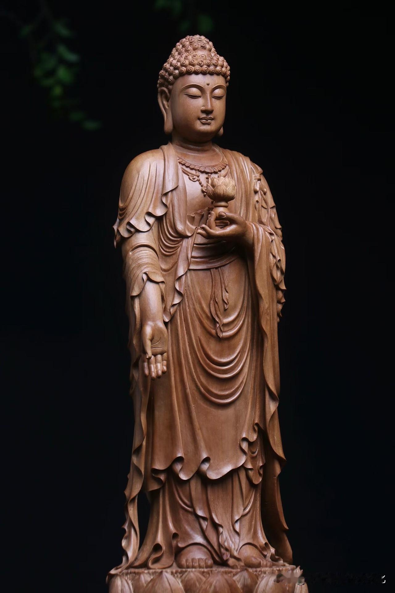 再看形。阿弥陀佛立于莲台,右手下垂接引,左手托莲,姿态不紧不迫,像是在等,也像是在渡。面容圆润,垂目含光,没有刻意的威严,却更让人安心。