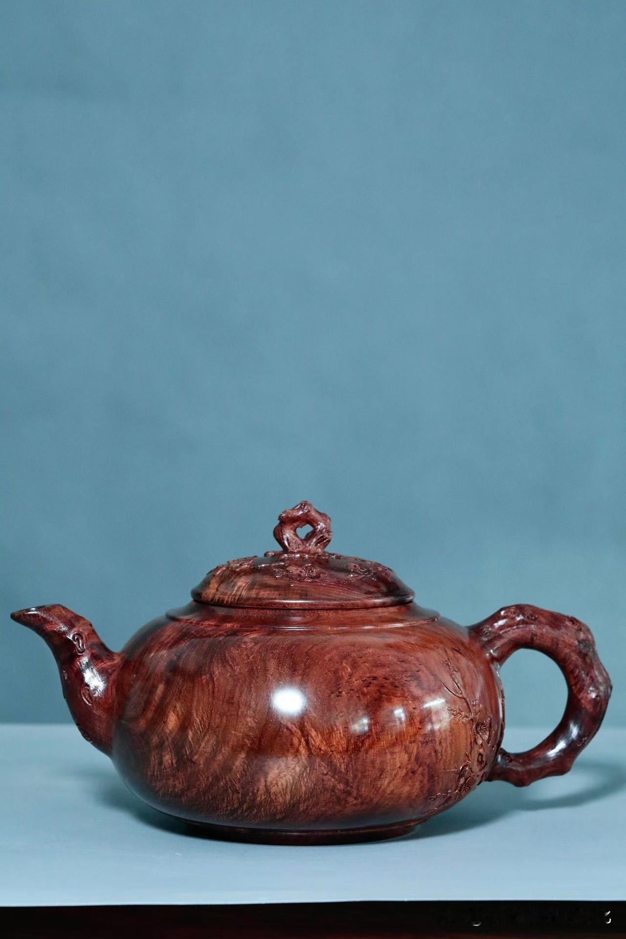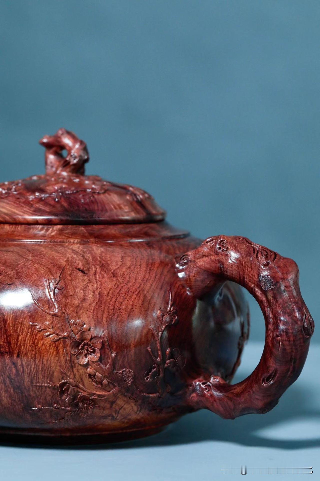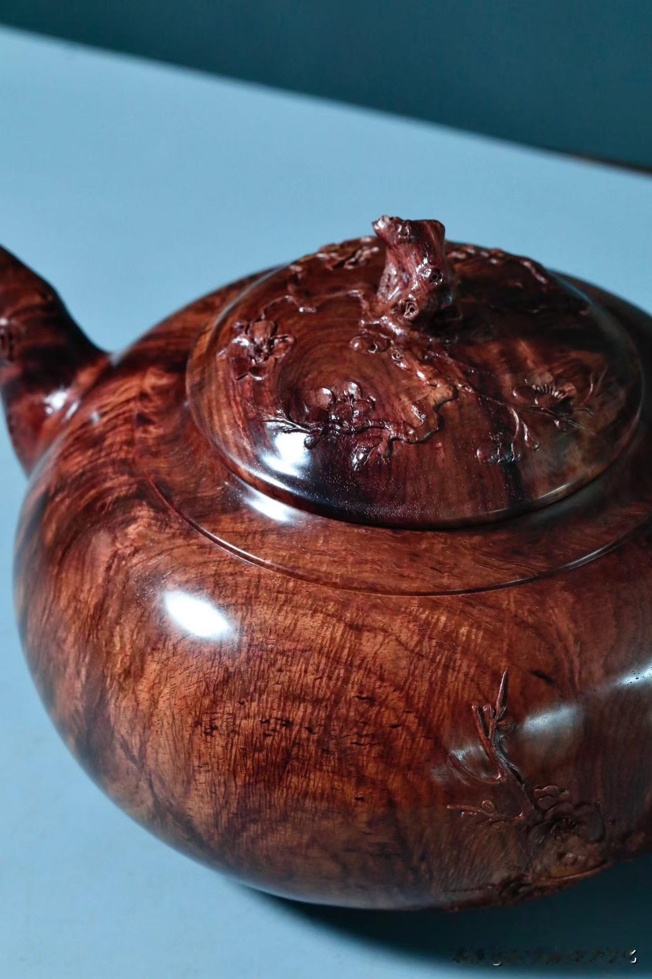 刀工反而是收的。梅花点缀壶身,不求繁盛,只取一枝清气。线条顺着木性生长,有起有伏,有轻有重,留白处反倒更见气场。
