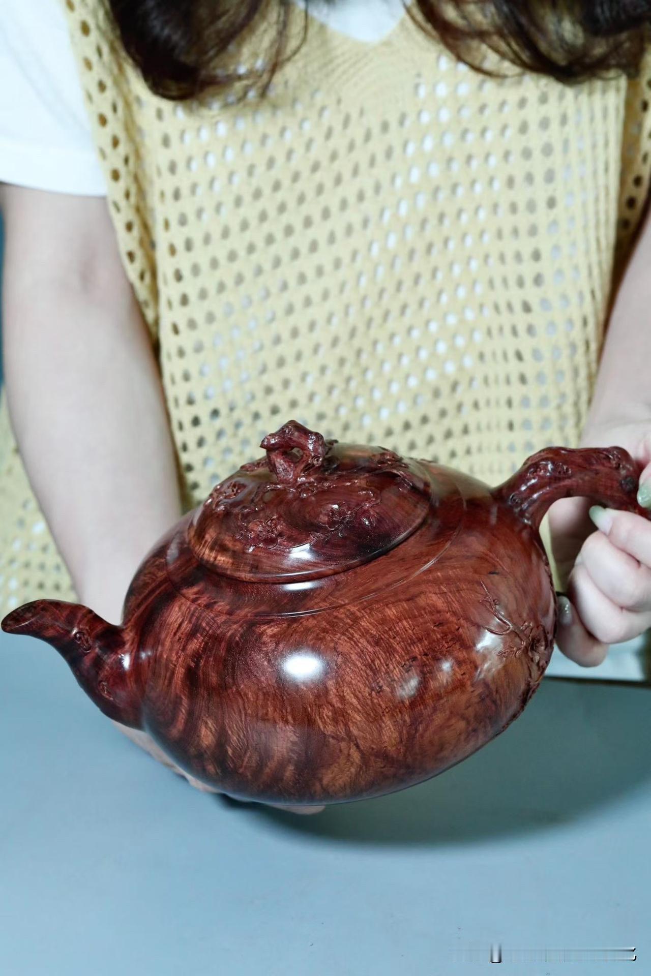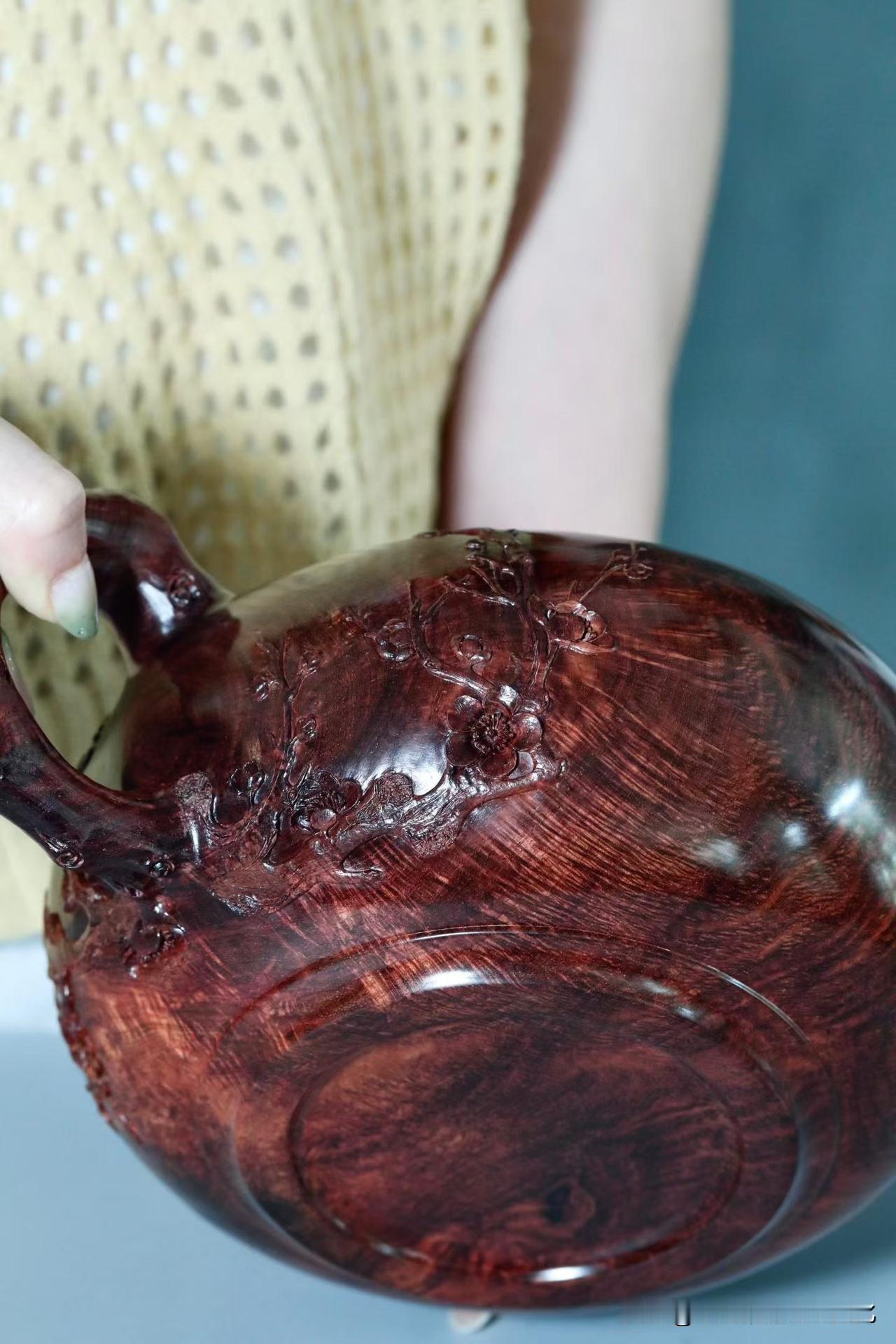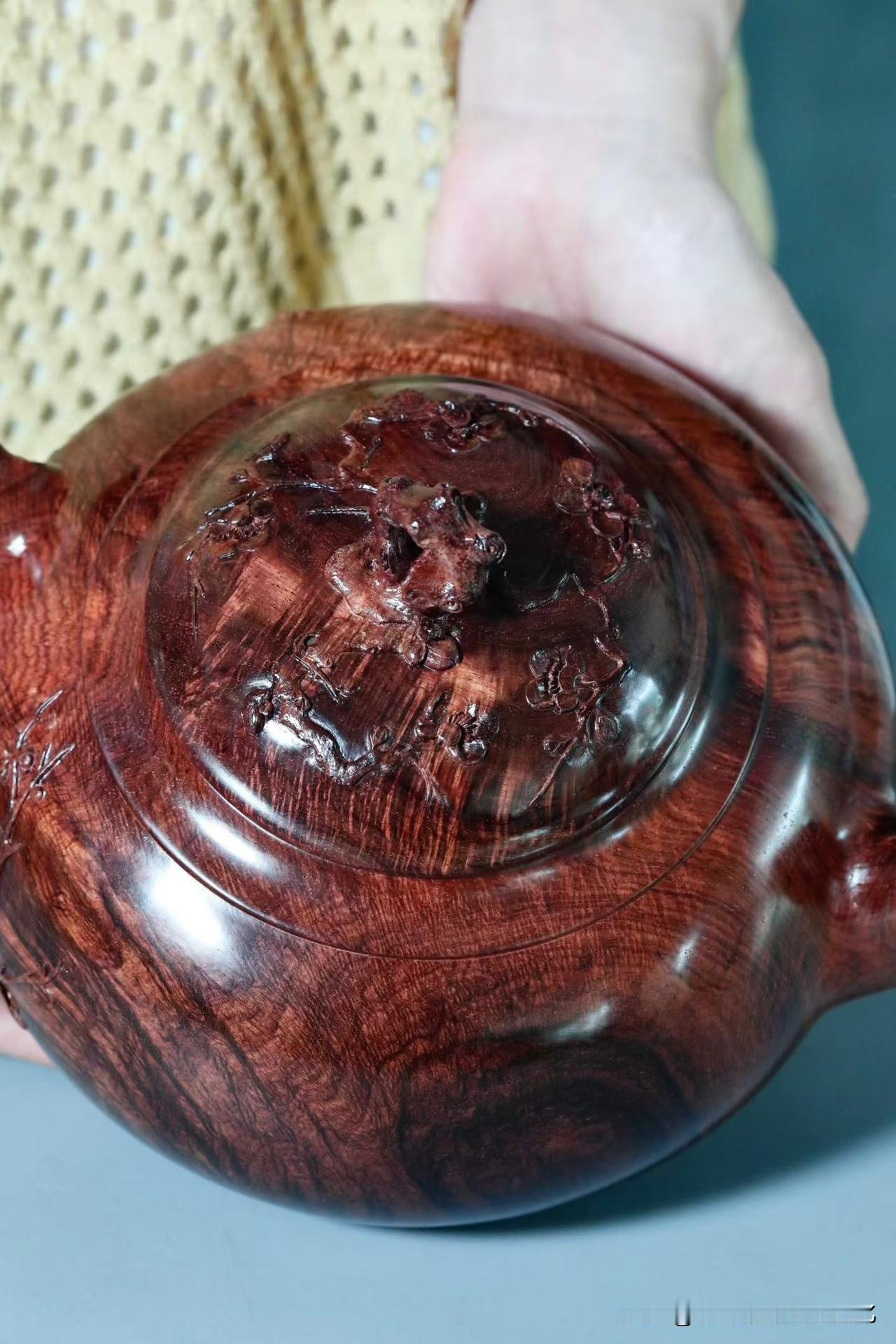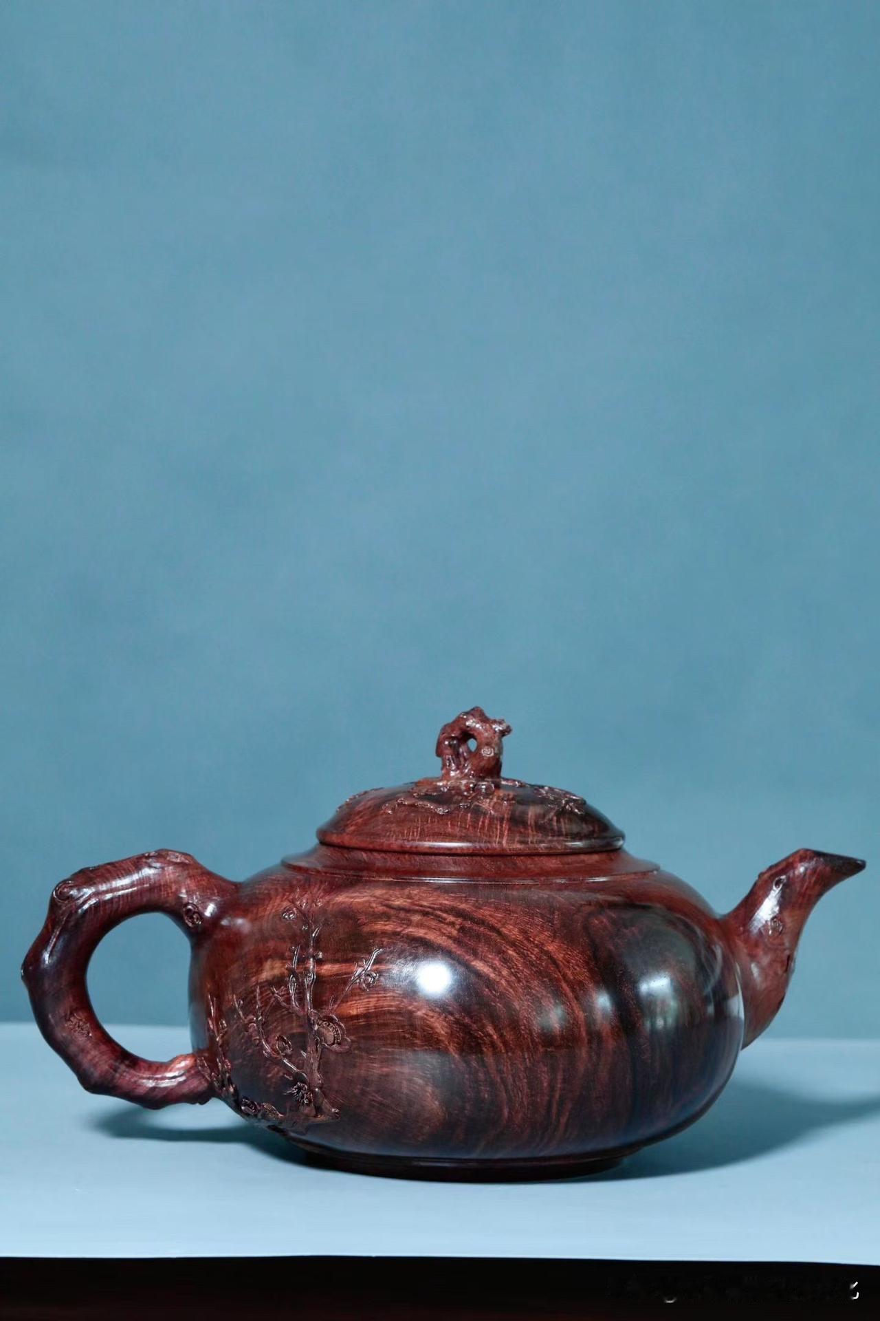刀工反而是收的。梅花点缀壶身,不求繁盛,只取一枝清气。线条顺着木性生长,有起有伏,有轻有重,留白处反倒更见气场。