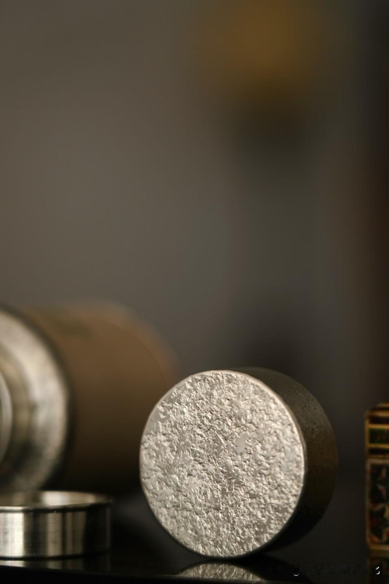 这一只猛犸茶叶罐,素身温润,像一块被时间慢慢抚平的玉。连体掏空的结构干净利落,上下锡口手工锤纹,微微起伏,不张扬,却有手作的温度在里面。