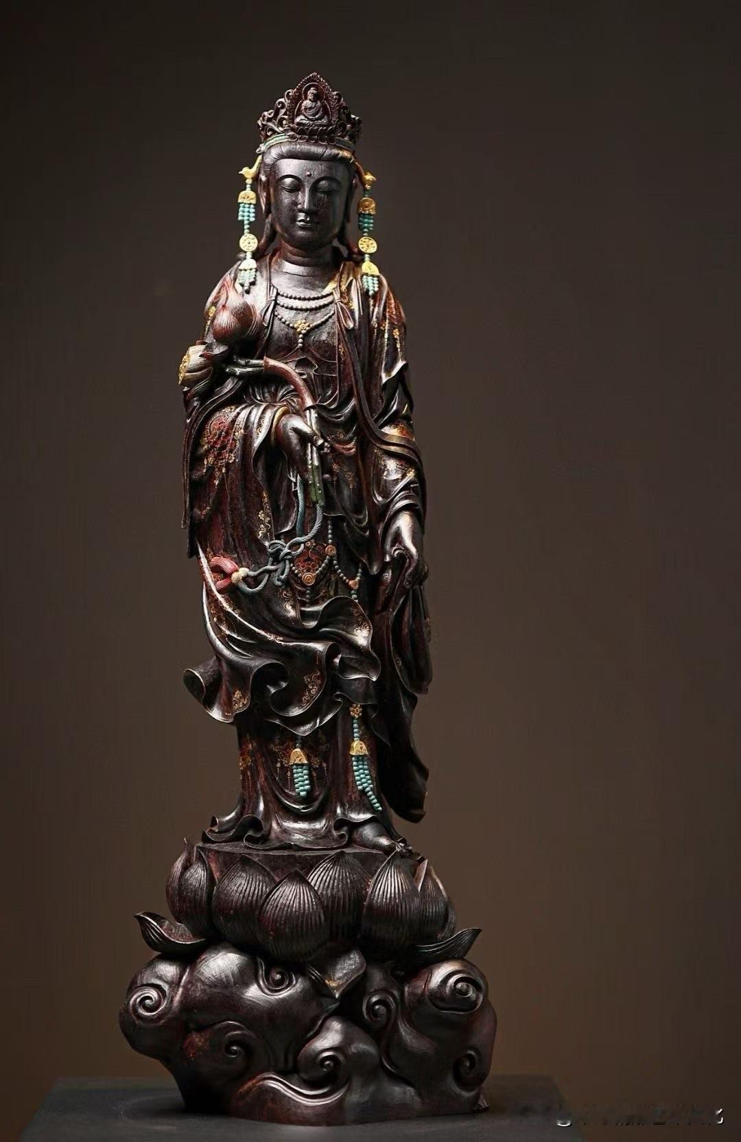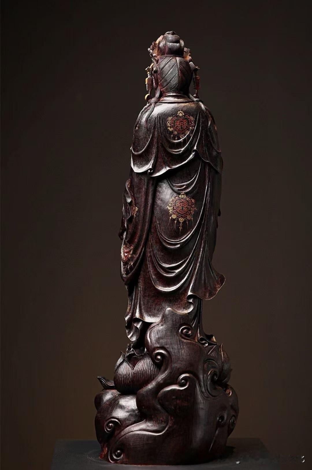 这尊观音,先是气。紫檀本身的沉稳,把整件作品压住了——光不浮,色不躁,像一口深井,越看越有层次。