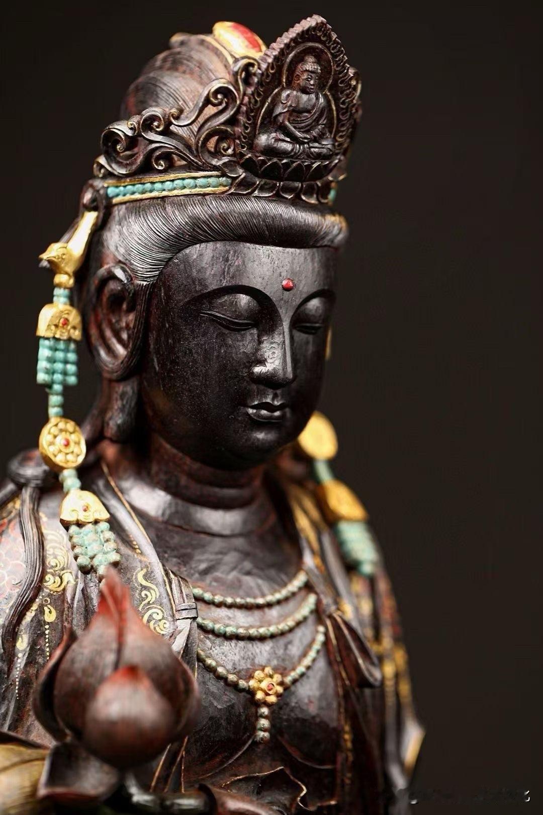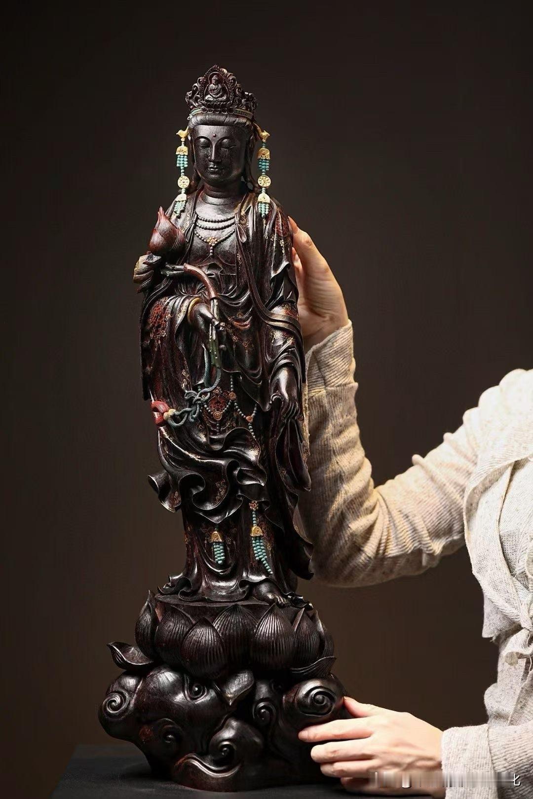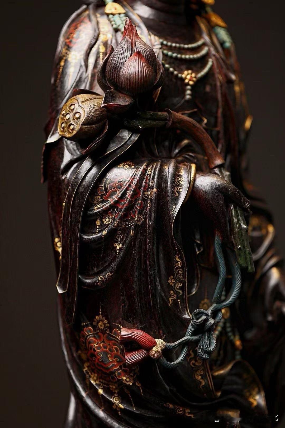 再看形。立姿微倾,一手持莲,一手拈衣,动得极轻,却让整尊像有了呼吸。面容不刻意求“神”,反而在垂目之间,多了一种温和真实的慈悲。