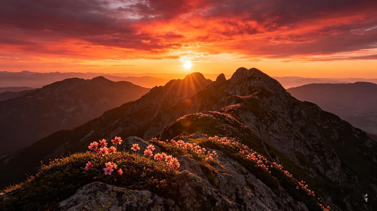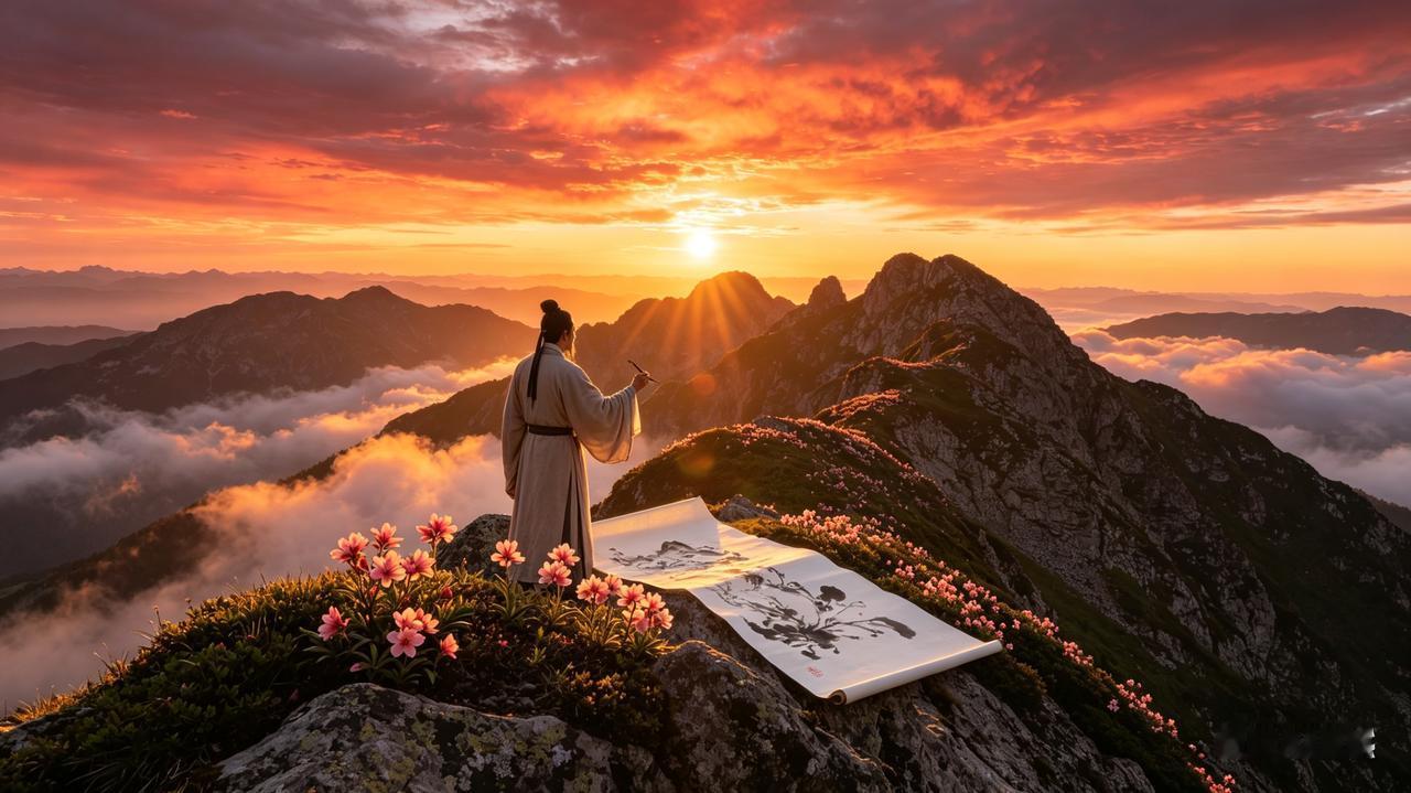 “残阳喷锦霞,危岭织新花”,开篇便见浓墨重彩。夕阳像熔金般喷涌出漫天锦霞,山尖上的新花如巧手织就的锦绣,“喷”字见气势,“织”字显精巧,把暮春的热烈与细致都托了出来,仿佛眼前就是霞光漫卷、花潮漫山的盛景。