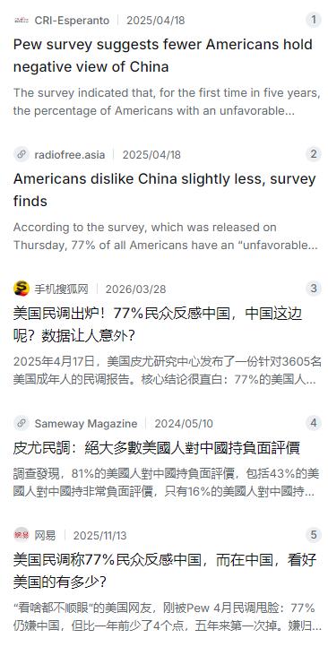 2024年的调查报告显示,高达81%的美国人对中国持负面看法,其中43%还是“极度反感”。到了2025年4月,情况有了微妙变化:皮尤再次发布报告,3605名美国成年受访者中,对中国持负面态度的比例降至77%。