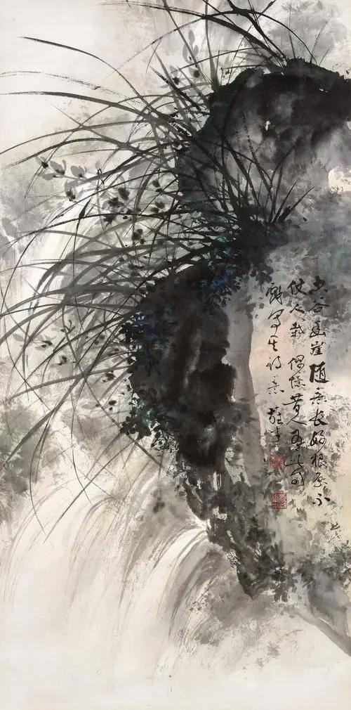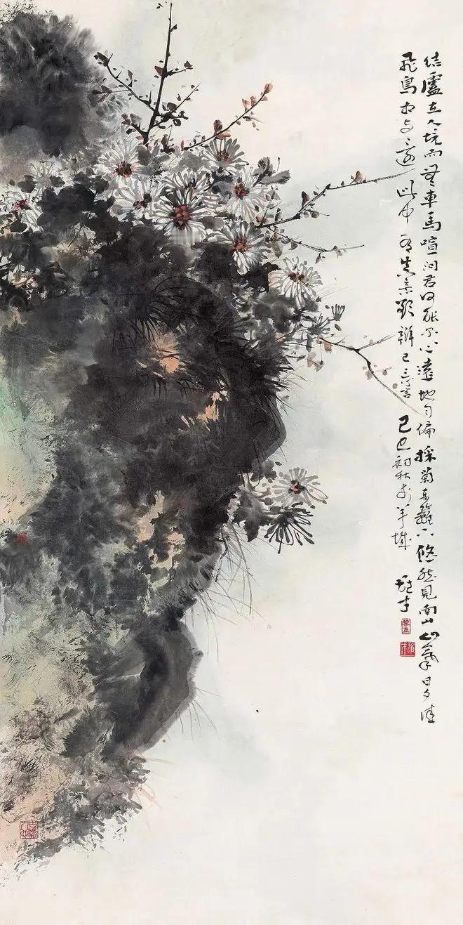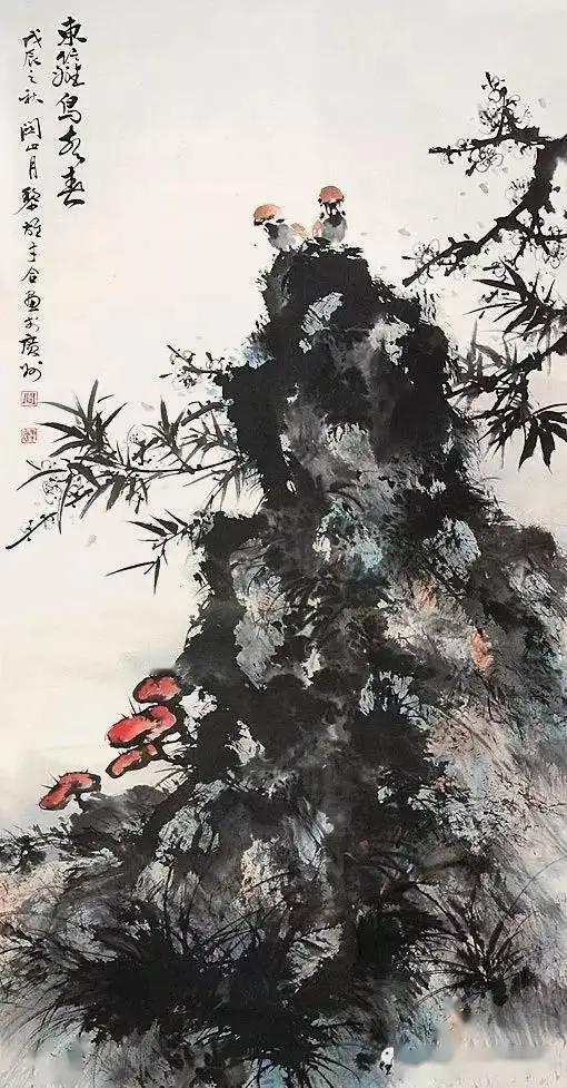 他的花鸟画同样造诣深厚,将传统笔墨与日本画“朦胧体”结合,干笔皴擦与淡墨渲染相得益彰,兼具宋元精微与西画光影。其深谙留白之道,构图极简,尽显东方美学意境。作品以书法入画,线条刚劲灵动,气韵贯通。