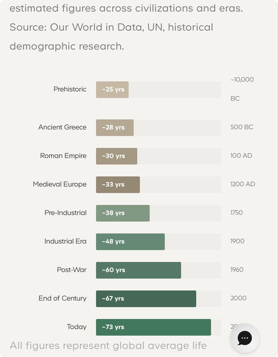 外媒:人类平均寿命从史前的约25岁,历经古希腊(28岁)、罗马帝国(30岁)、中