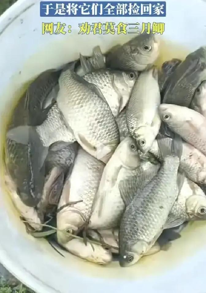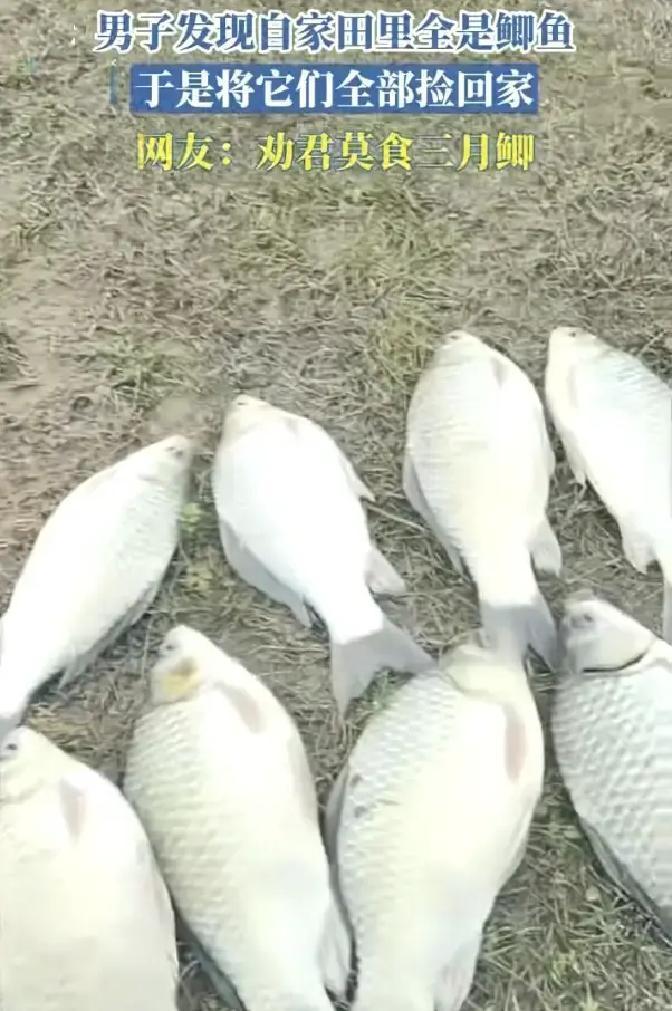 江西,一名男子发现自家田里突然出现大量鲫鱼,浅浅的水面上全是乱蹦的鱼,连田埂边都能看见白花花一片,他随手拿来盆子一盆一盆往家里捡,原本只是把这份意外收获拍成视频发到网上,没想到评论区一下子吵翻了,很多人盯着一句话在劝他,三月鲫鱼,最好别吃。