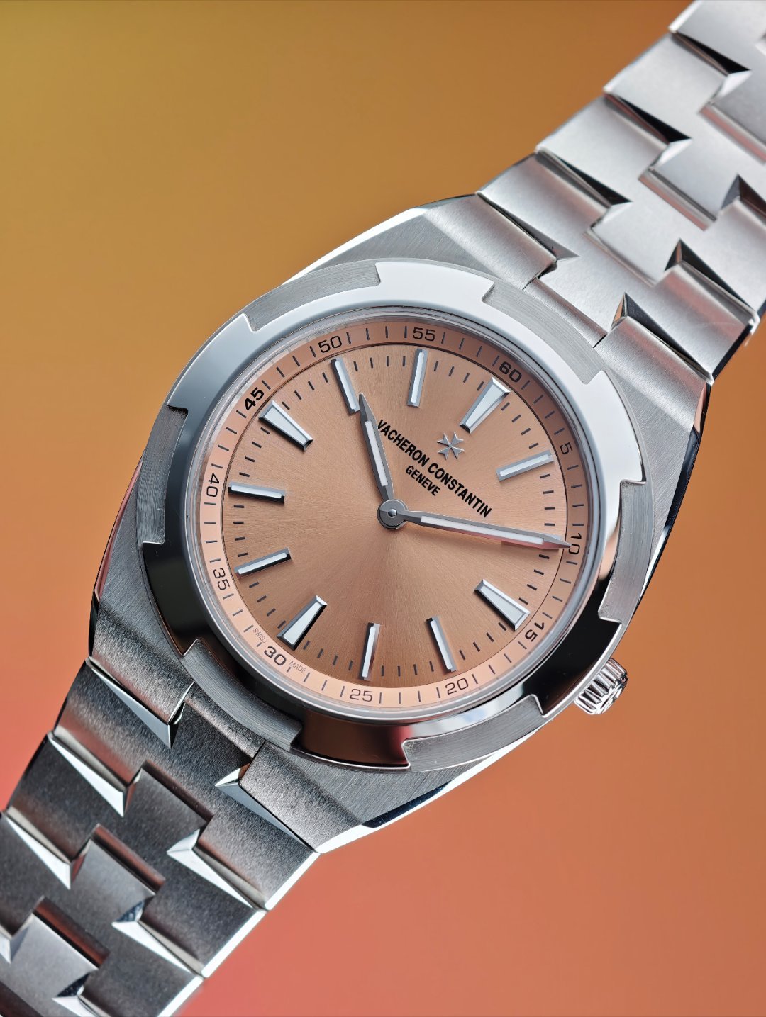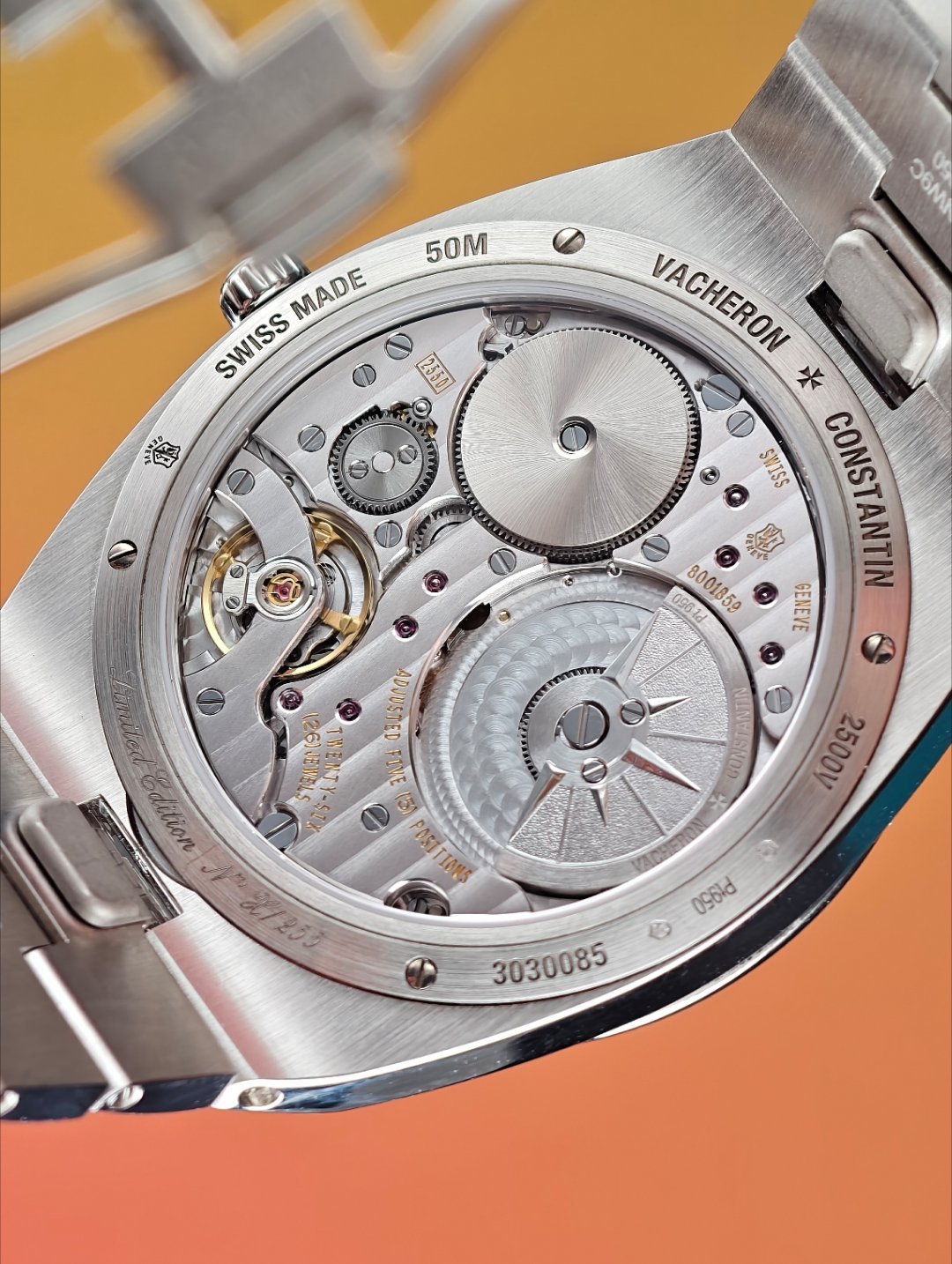 2. 三文鱼盘,通体铂金表壳表链,厚度只有7.35毫米,这枚新的2550机芯只有2.4毫米,但是居然有80小时的动储,真是样样都强。这也是纵横四海系列有史以来最薄的一枚自动上链腕表。