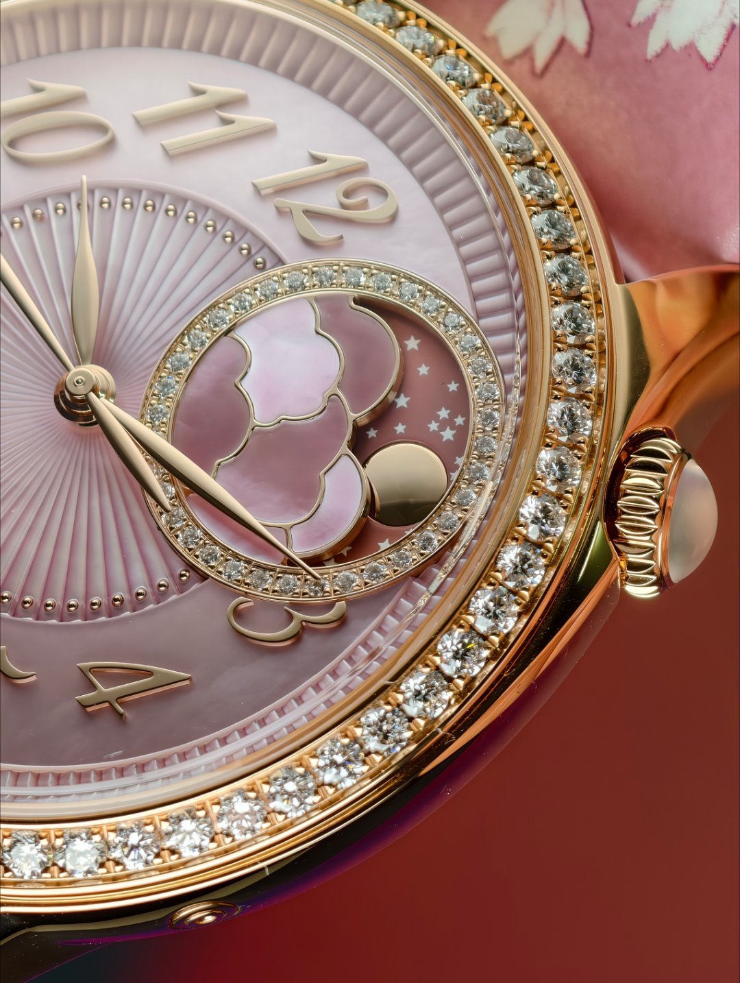 1. 粉色贝母盘,双环视觉构成,18K金精制的圆月在云层中现身隐身,美得不像在人间。这枚是江诗丹顿 ÉGÉRIE 伊灵女神系列“繁花春锦”月相腕表。名字都好听。