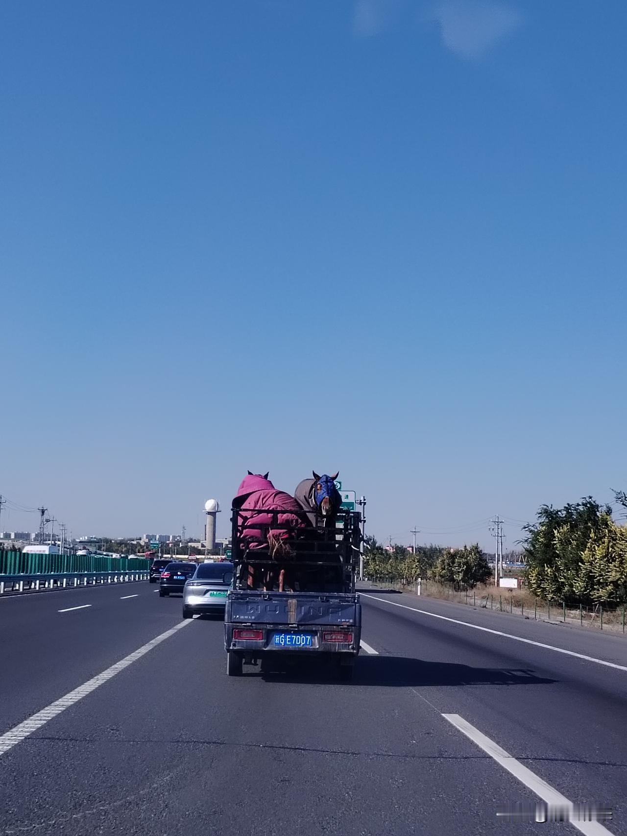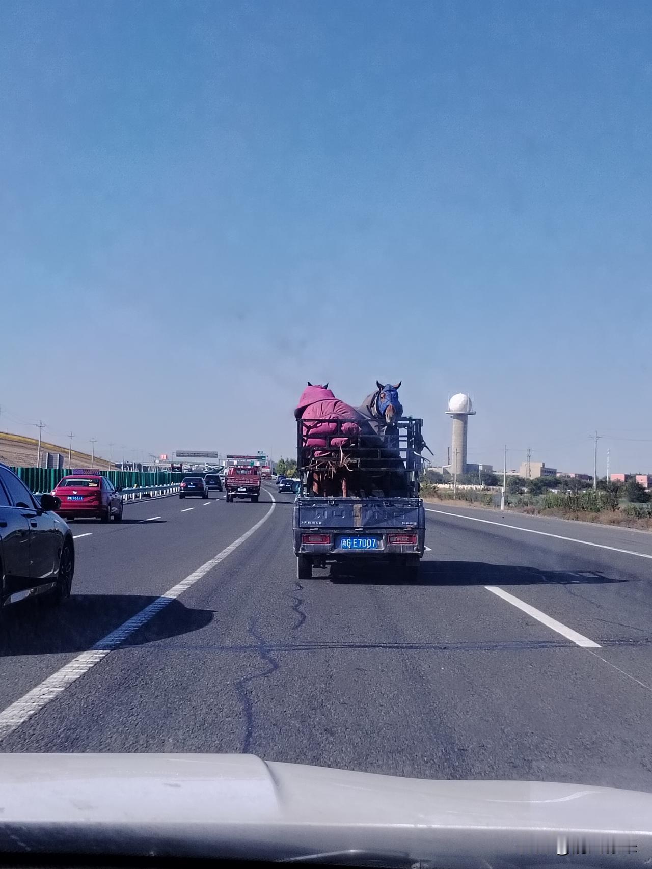 昨天在往昌吉的路上遇到一辆塔城牌照的皮卡车,车上拉着两匹枣红色的马,厢栏板不高,