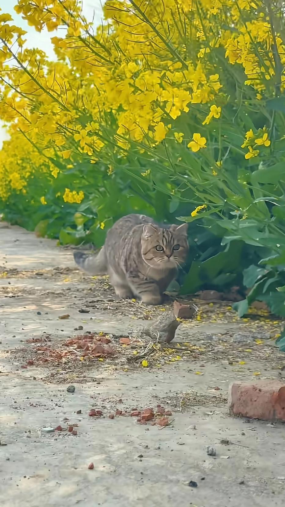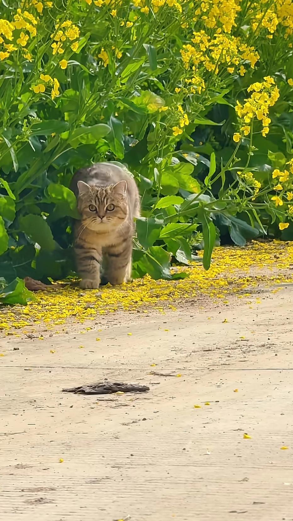 猫,蹑手蹑脚地走进春天。 油菜花田,浓郁的香气,袅袅升起。小径被菜花染黄。一只猫