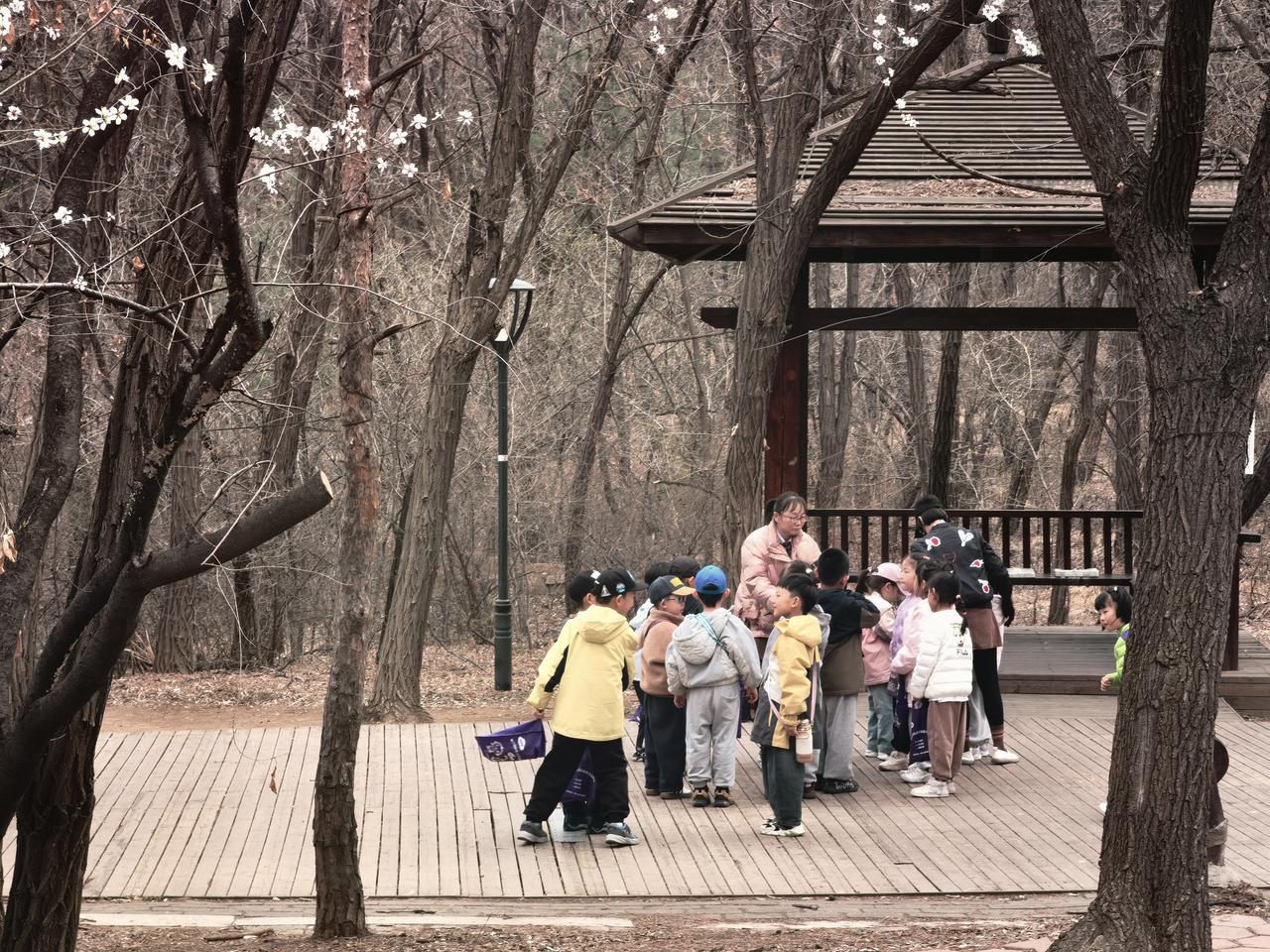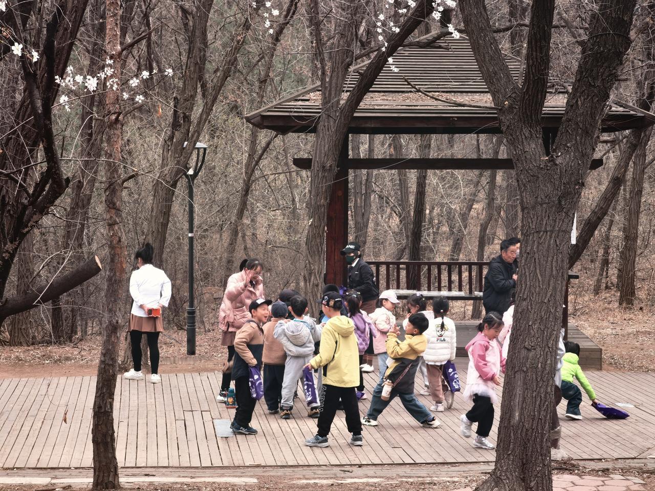 原本安静的小亭子边,孩子们恣意地跳着、闹着、唱着,一尘不染的快乐,漾满山野。他们随意地跑,捡着一小朵落花,摇着松树枝,或是挖一小块绿苔……