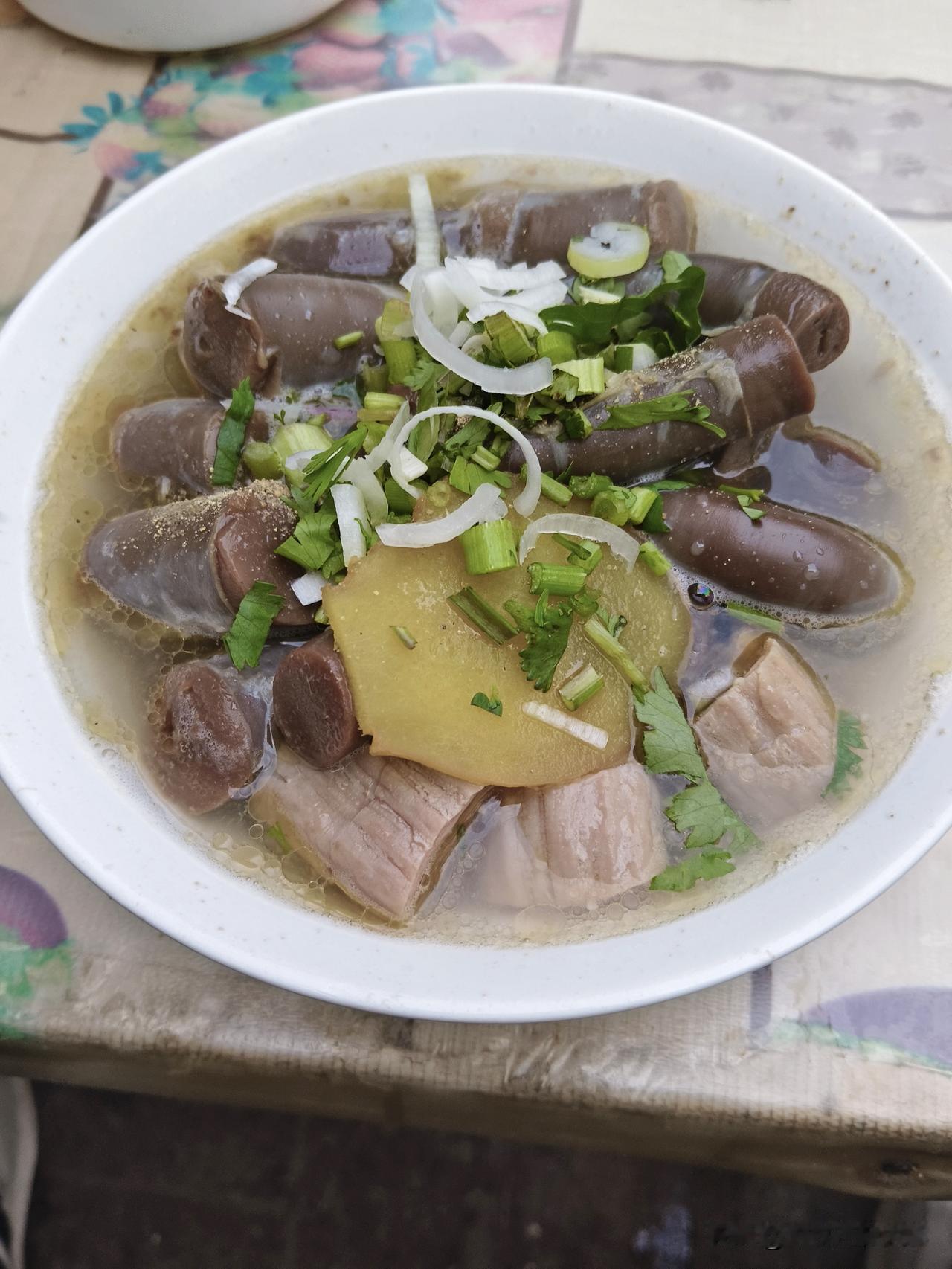 今天去吃羊肠子,火烧一块,扫码,说两句话。