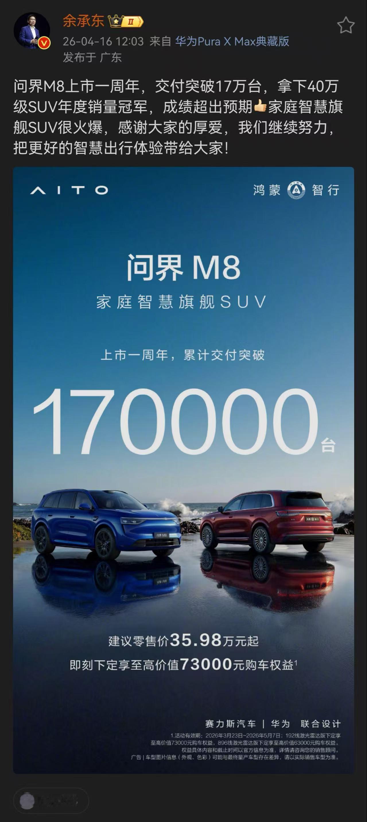 问界M8上市一年交付突破17万 17万的交付量,是17万个家庭的信赖。问界M8以