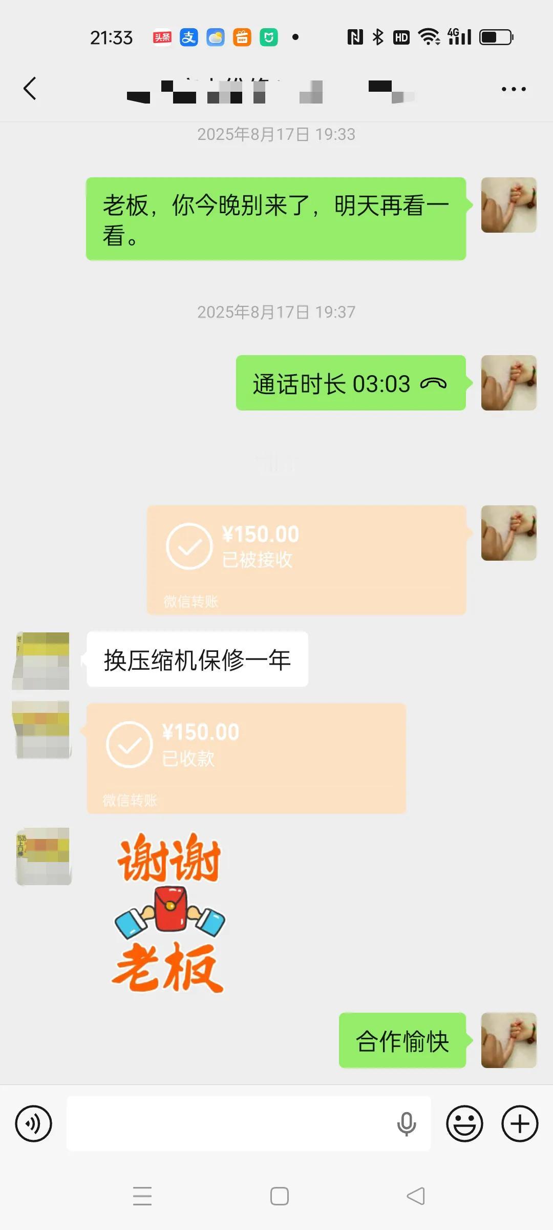 他换上之后说你要么给我150块钱充氟利昂的钱,我继续给你保修一年,如果不给钱就保修到到期。