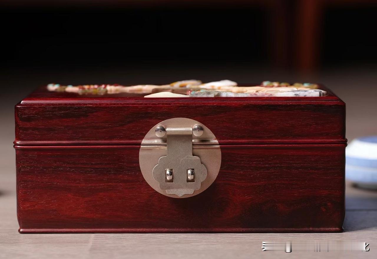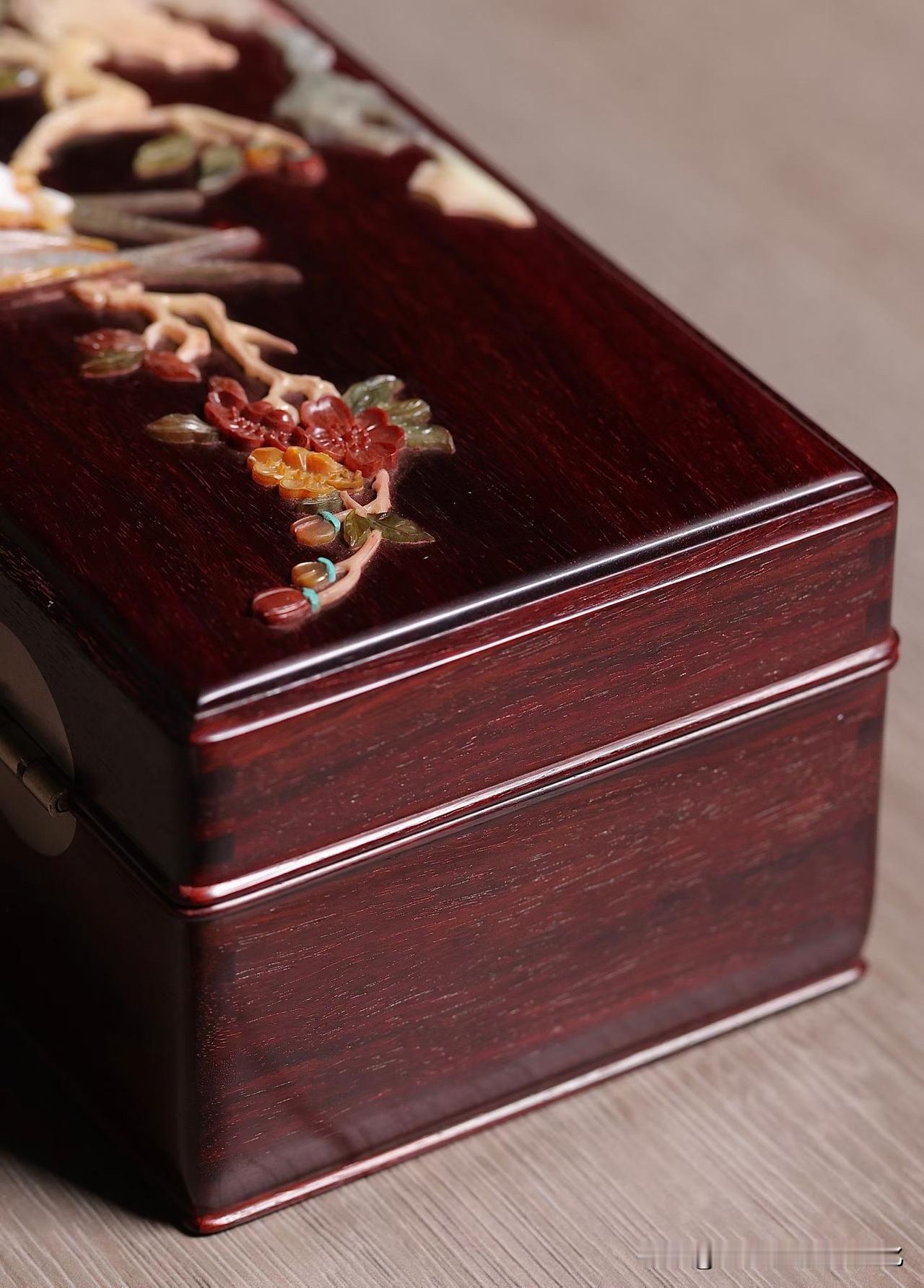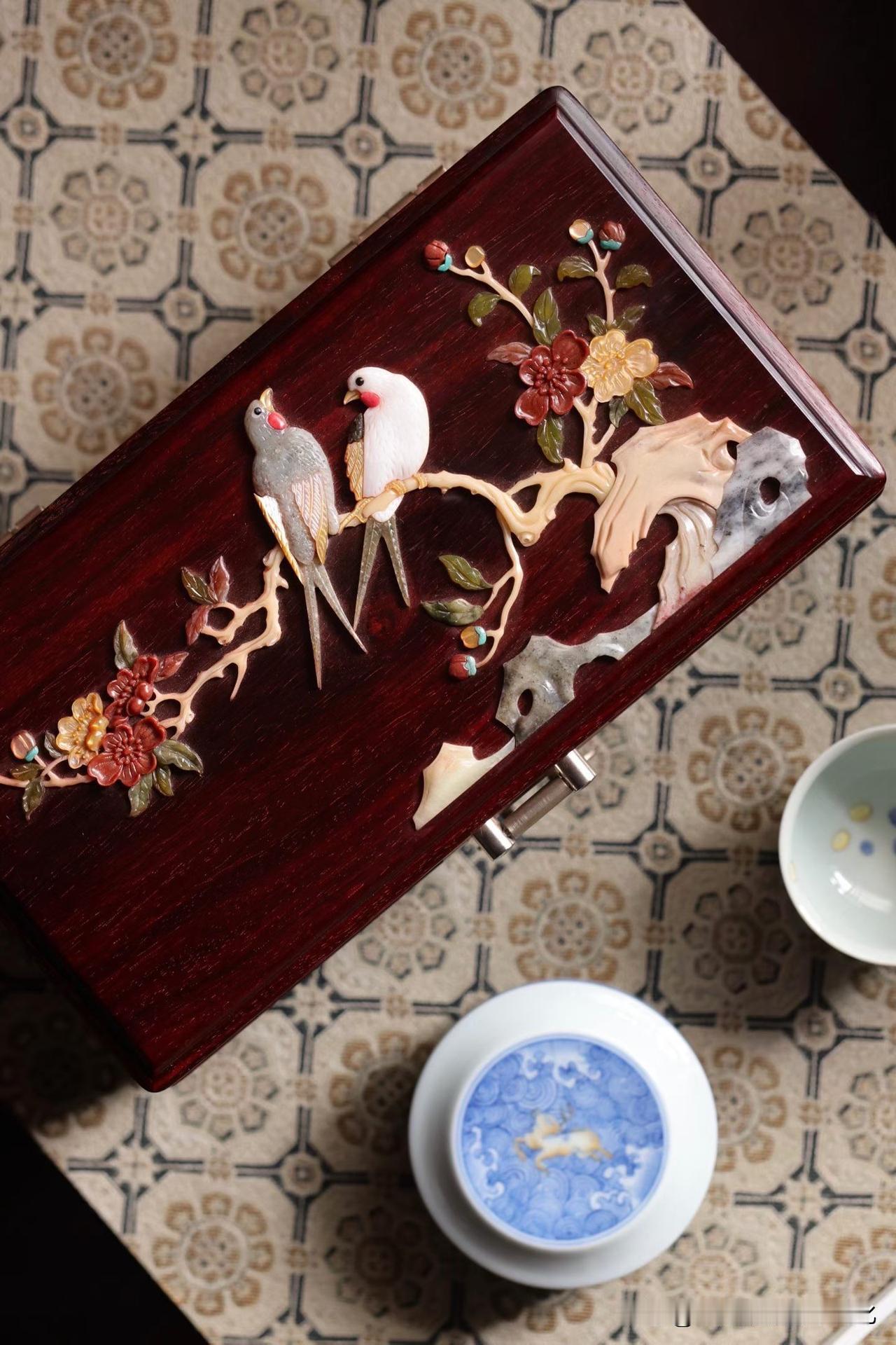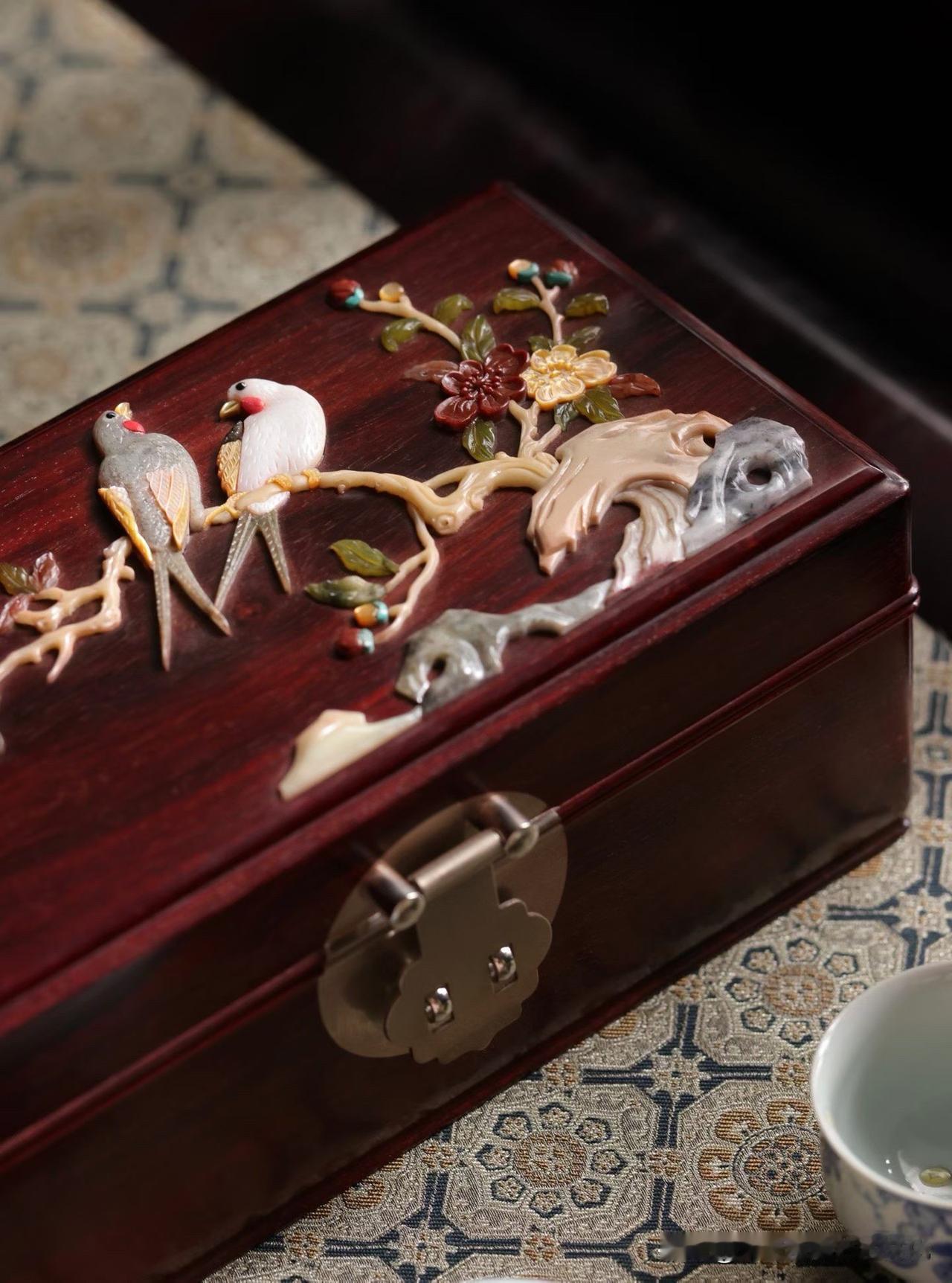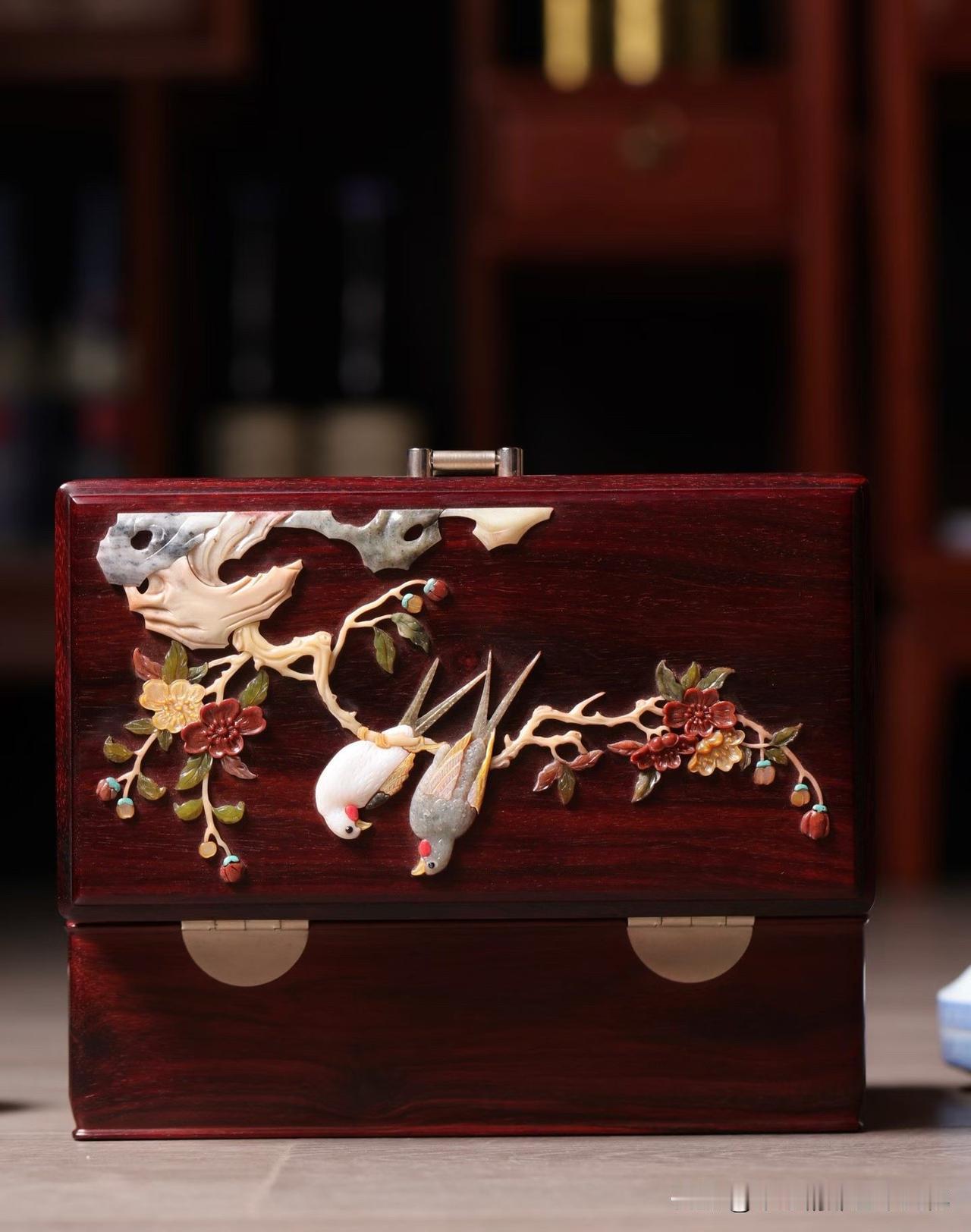 小叶紫檀的底色深沉温润,光泽含蓄,不争不抢,却自带分量。其上百宝嵌花鸟,枝头双雀,花开正盛,一点一点嵌出来的生机,细看才知有多耐心。