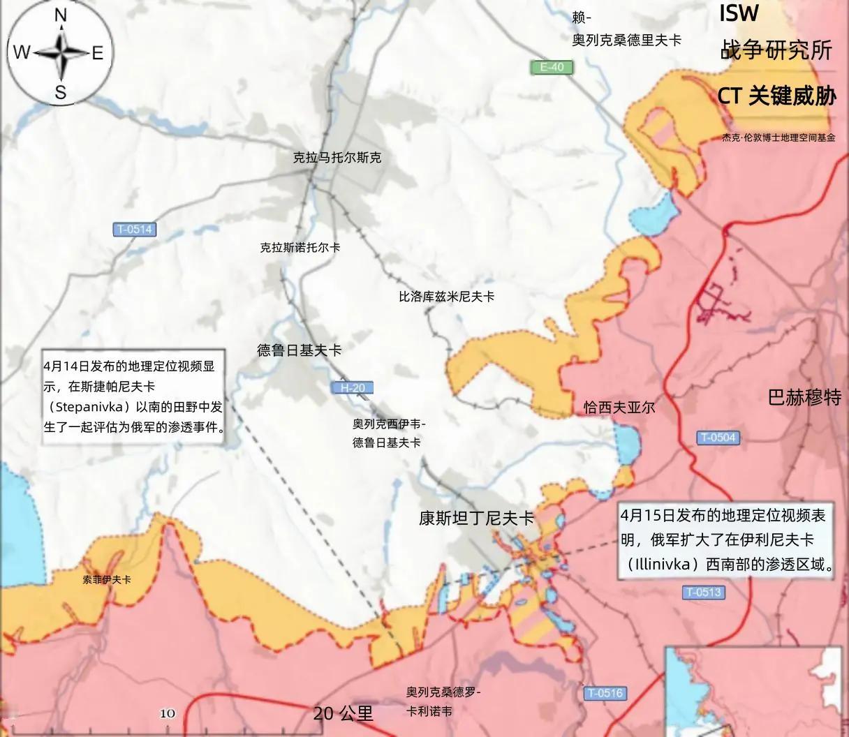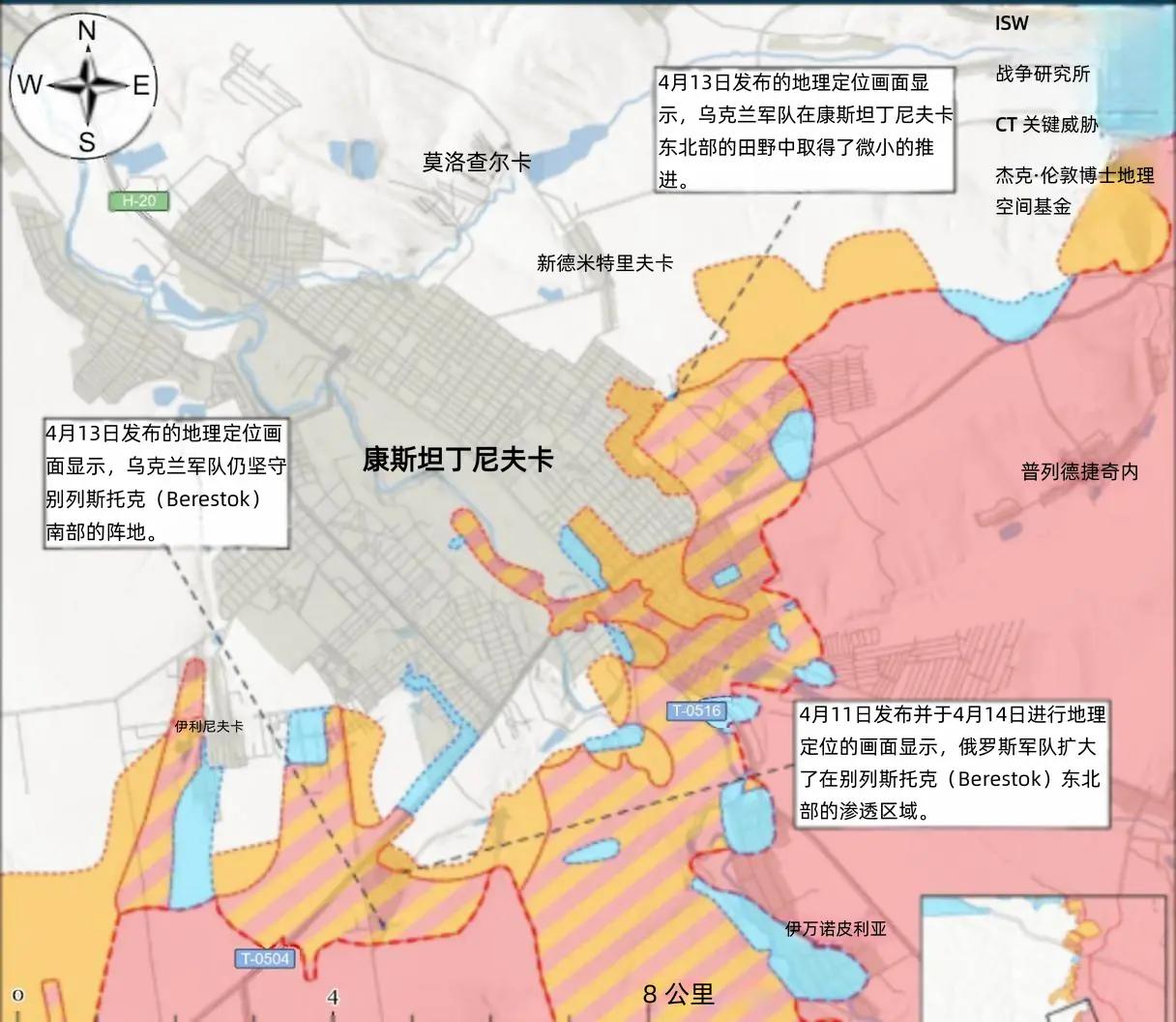 4月13日的地理定位视频显示,乌军在康斯坦丁诺夫卡以东小幅推进,并在城南贝列斯托克取得进展,小幅压缩俄军前沿。但战争研究所评估,俄军已绕至贝列斯托克南部乌军阵地侧翼实施渗透。