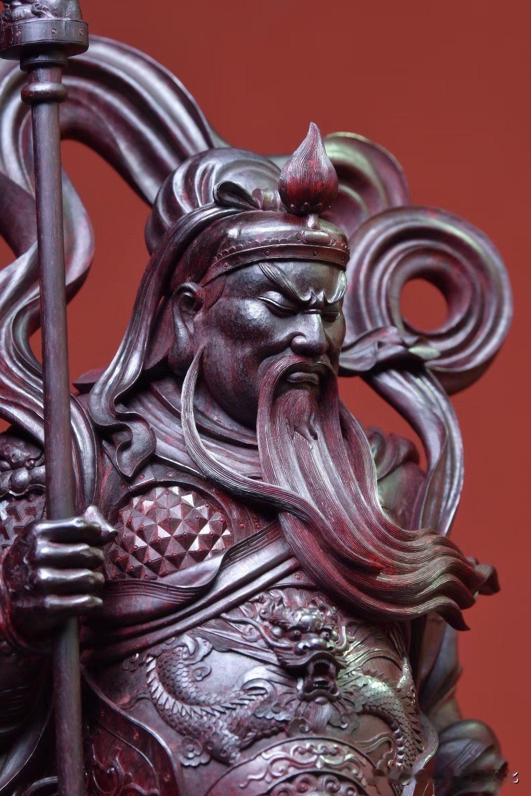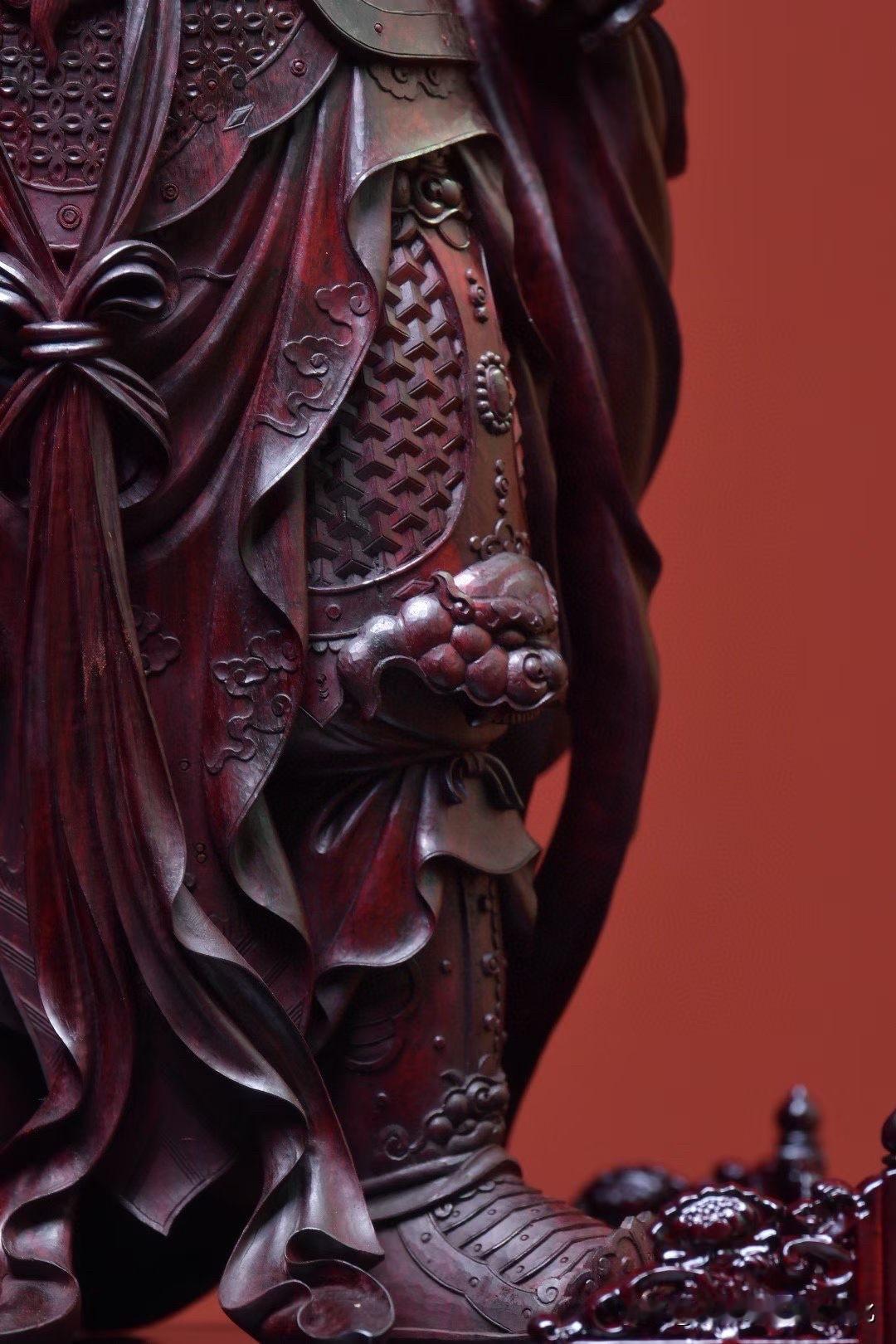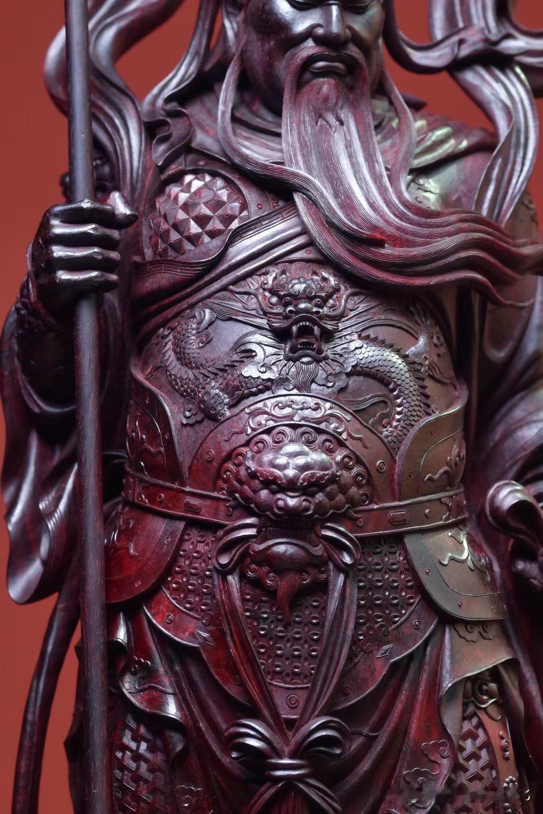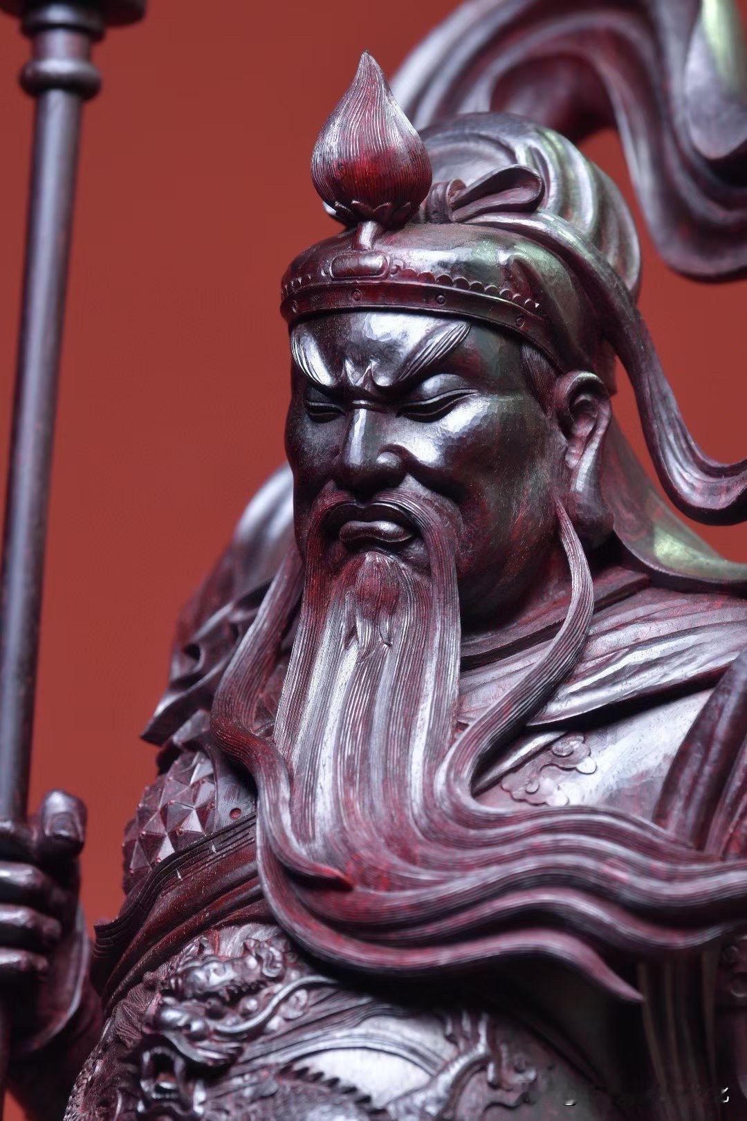 紫檀的沉润底色,把时间压进木性里,光不耀,却有分量。刀法不急,盔甲层层递进,衣纹收放之间,自有节奏,连长须的起伏,都带着一股“稳”。